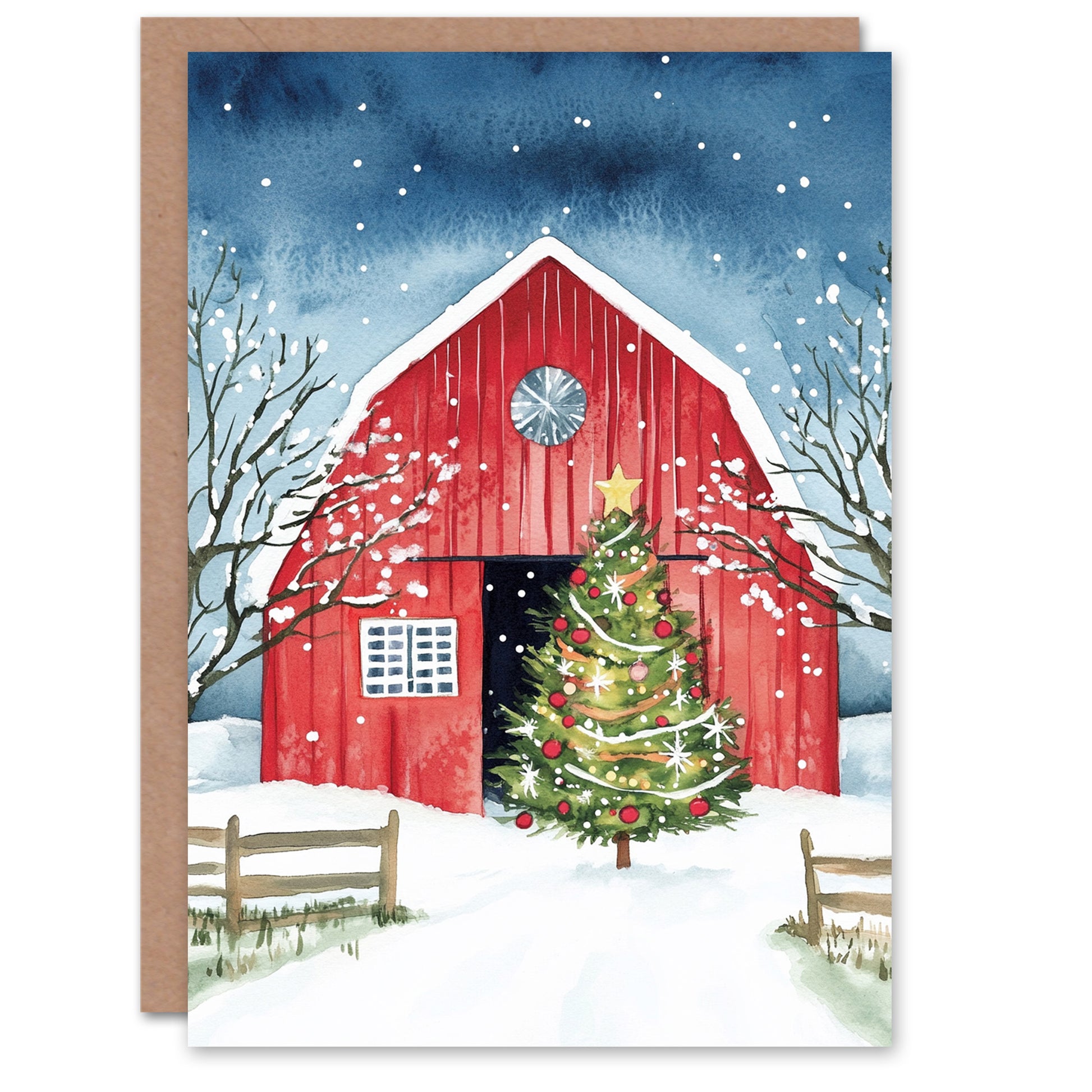 Barn Decorated Tree Winter Landscape Christmas Card