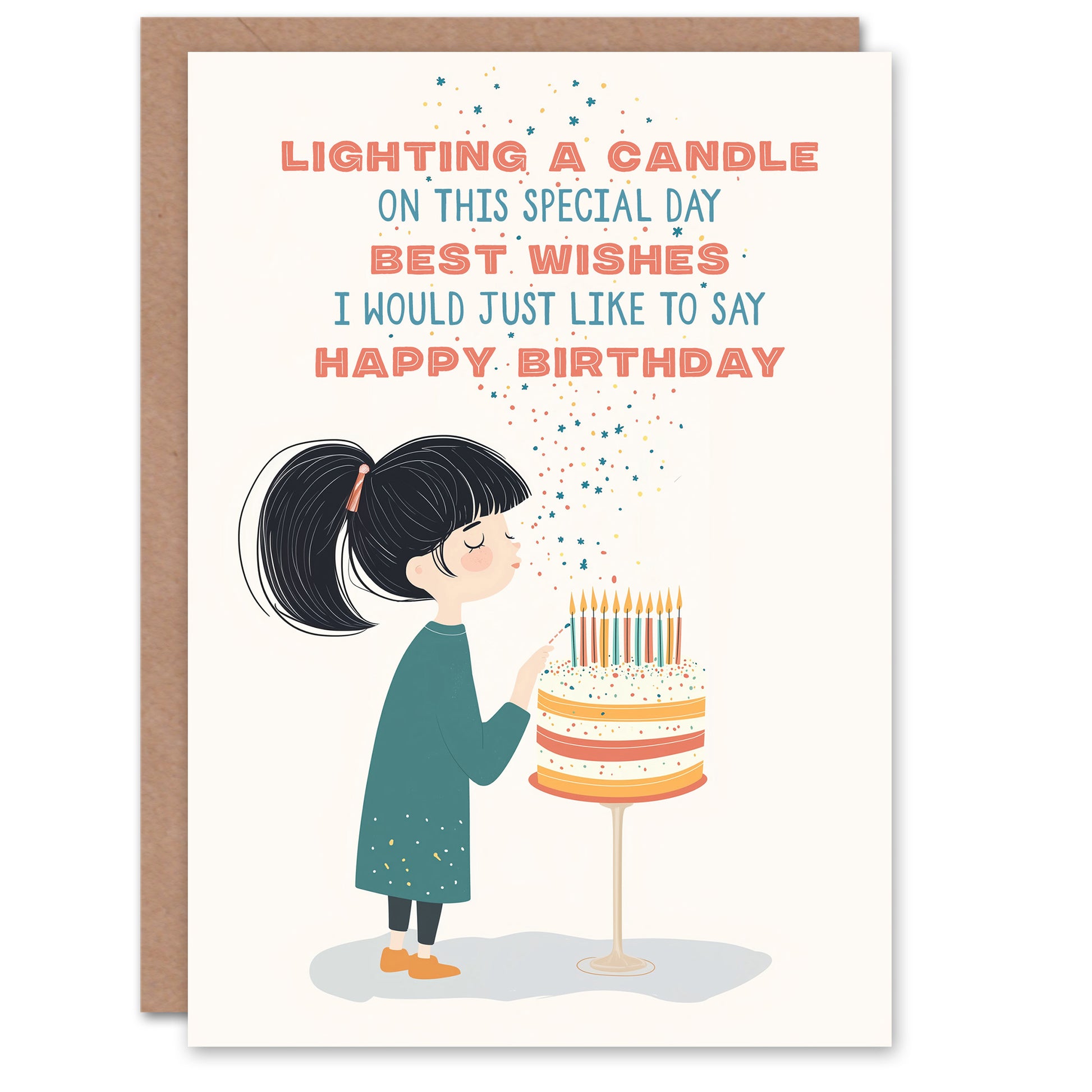 Birthday Card Girl With Cake Lighting Candle Best Wishes Poem