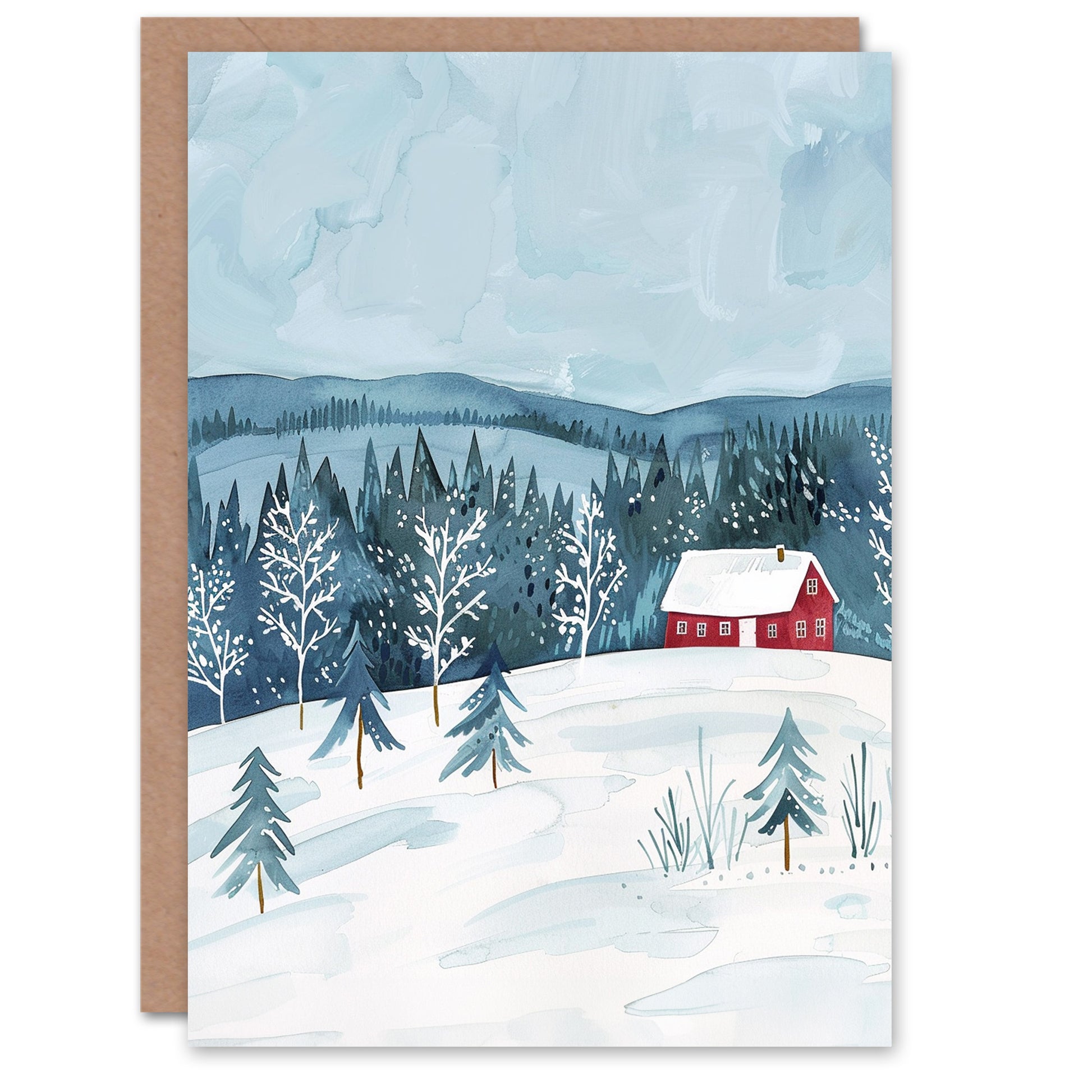 Cabin In Winter Snow Forest Landscape Christmas Card