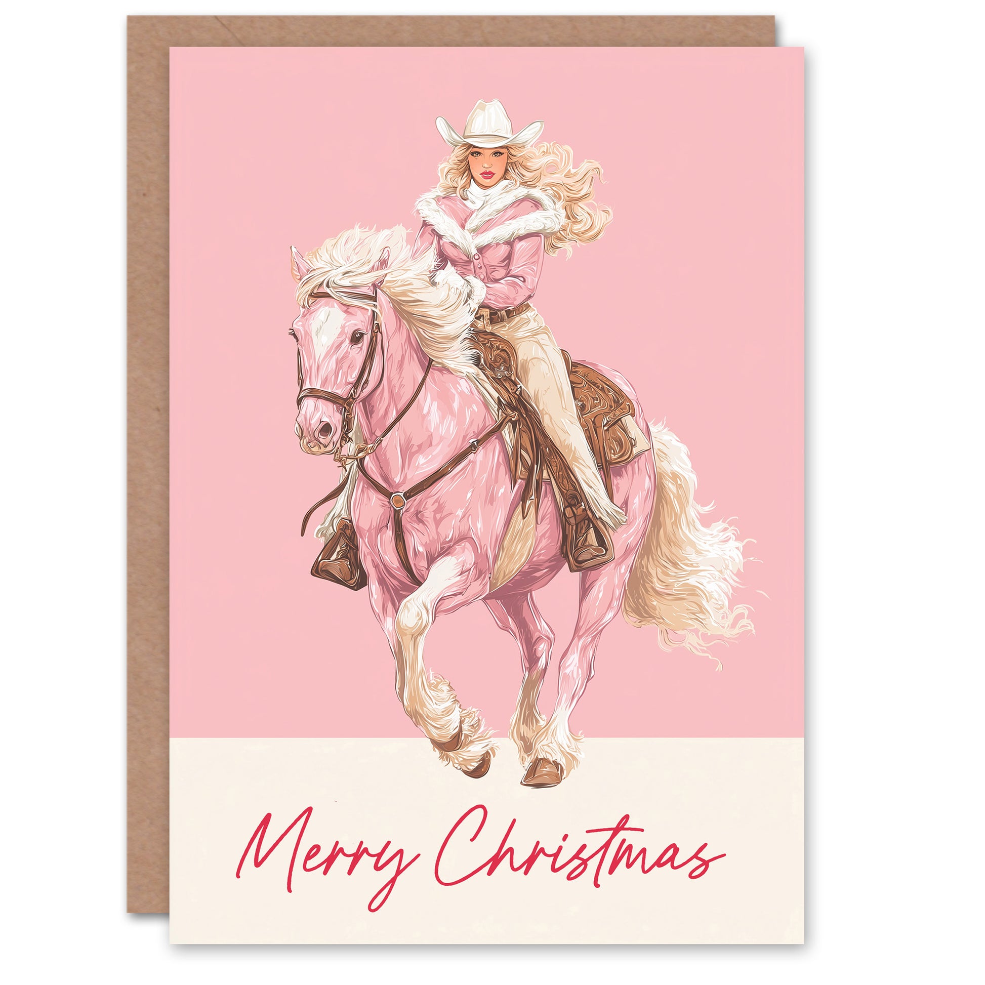 Christmas Card Blonde Cowgirl Riding Horse Baby Pink Theme