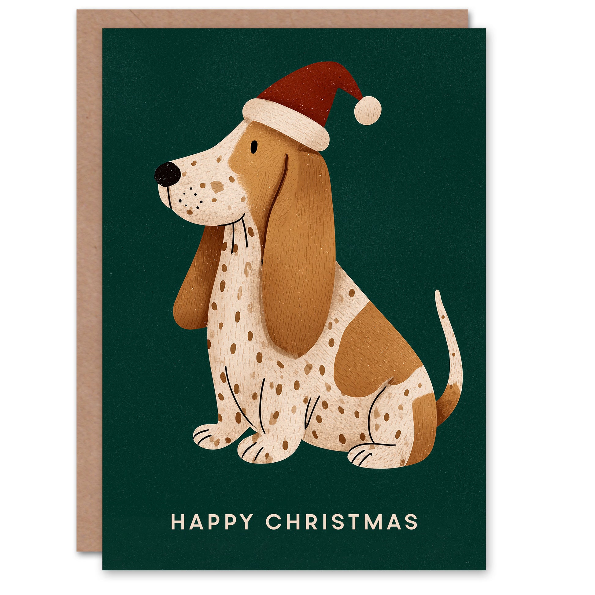 Christmas Card Cute Brown Spotted Basset Hound Dog in Santa Hat
