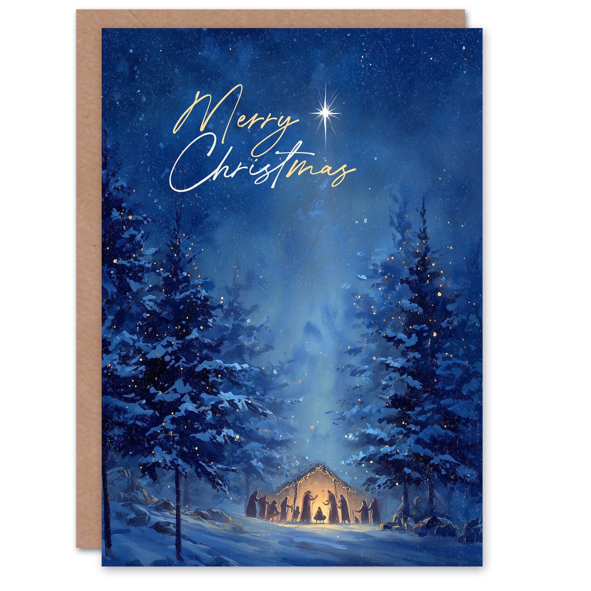 Christmas Card Nativity Scene in Snowy Winter Pine Tree Forest