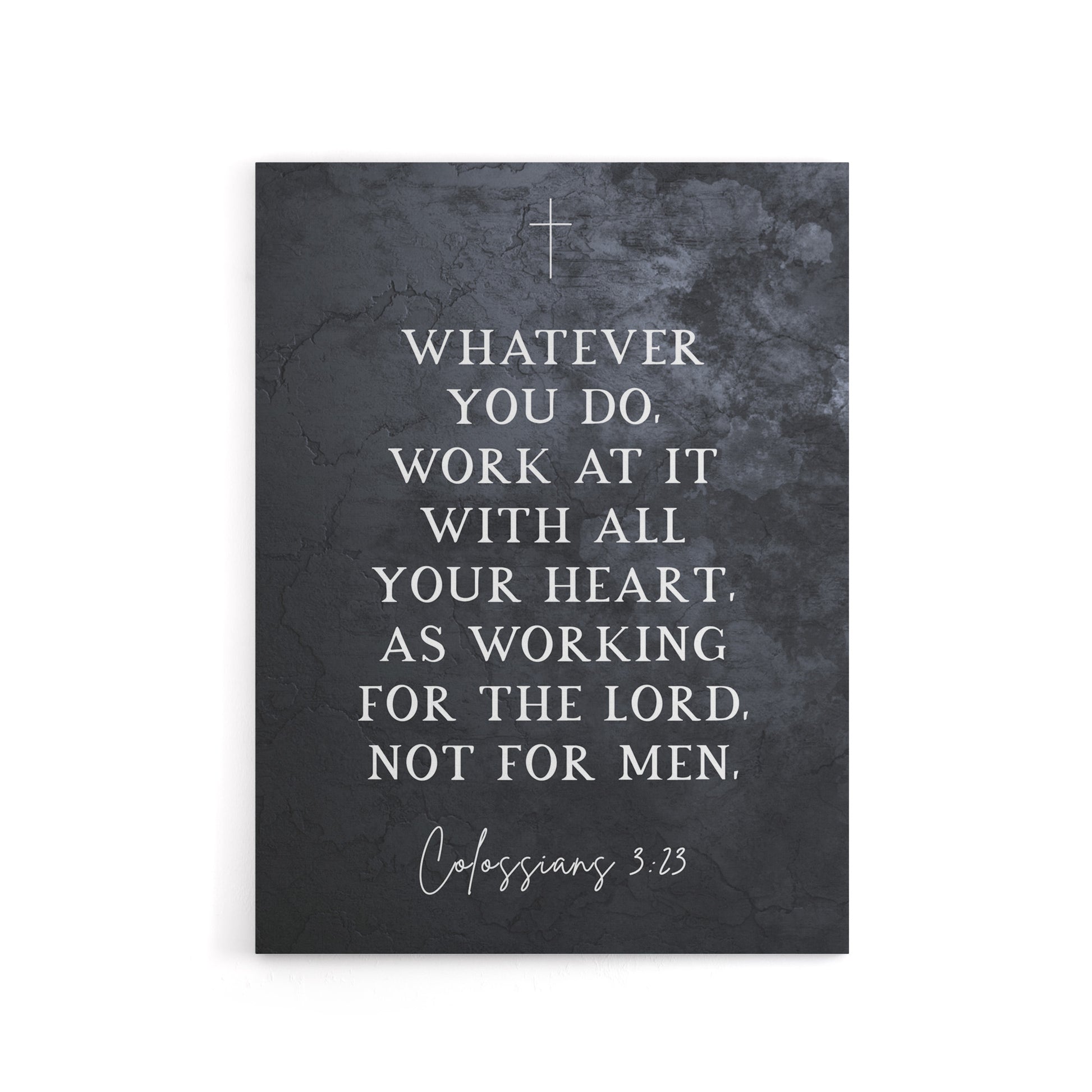 “Colossians 3 23 Whatever You Do Work At it With All Your Heart Christian Bible Verse Quote Scripture Typography” comes to life as a wrapped canvas print crafted for ready-to-hang display. This wrapped canvas print elevates your home with artful detail and vibrant colour. Versatile and ready to hang, it suits living rooms, bedrooms, offices, or creative studios. A stylish choice that adds personality and visual interest to your walls. “Whatever You Do, Work at It with All Your Heart,” motivating scripture design for workspaces or classrooms.