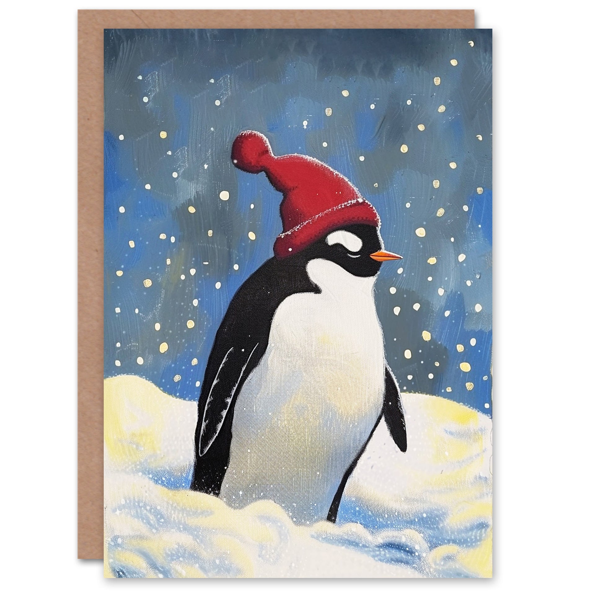 Cute Penguin Winter Hat Snow Painting Christmas Card