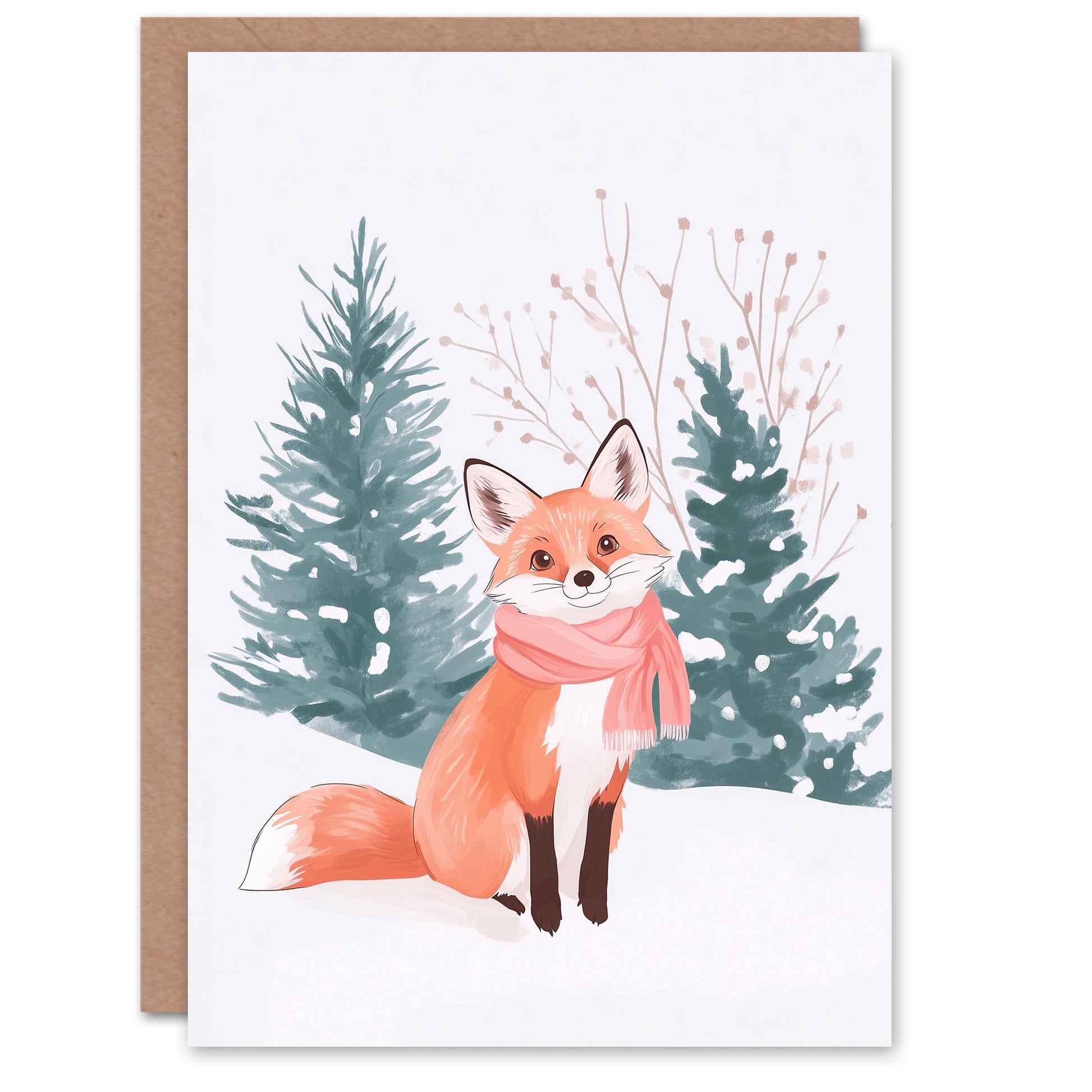 Cute Red Fox Pink Winter Scarf Snow Forest Festive Christmas Card