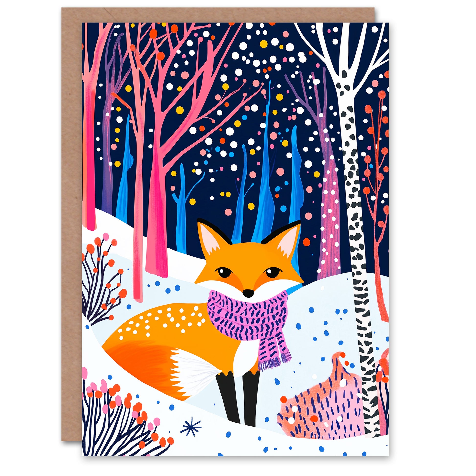 Cute Red Fox Vibrant Colourful Winter Forest Christmas Card