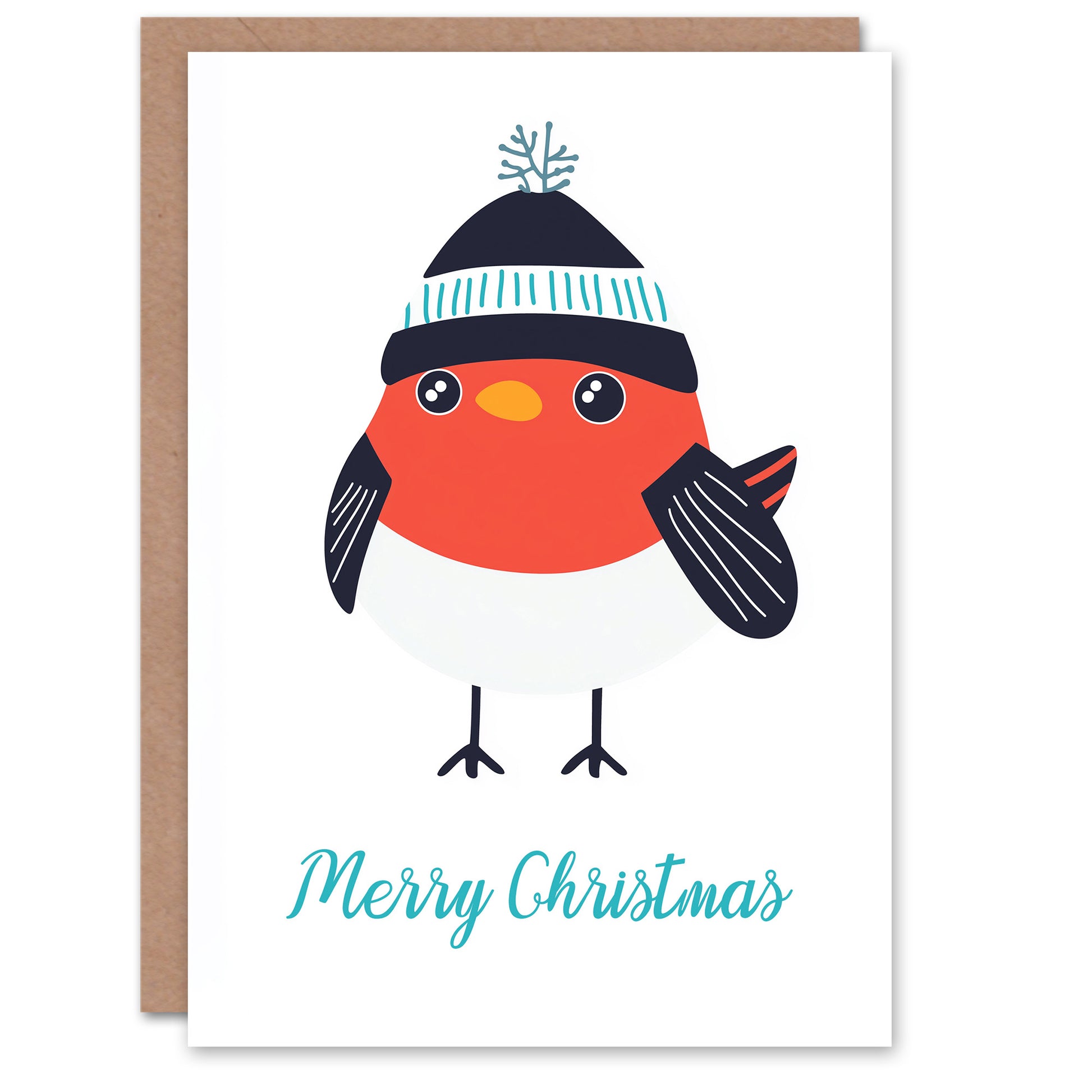 Cute Robin Bird With Winter Hat Bright Modern Christmas Card