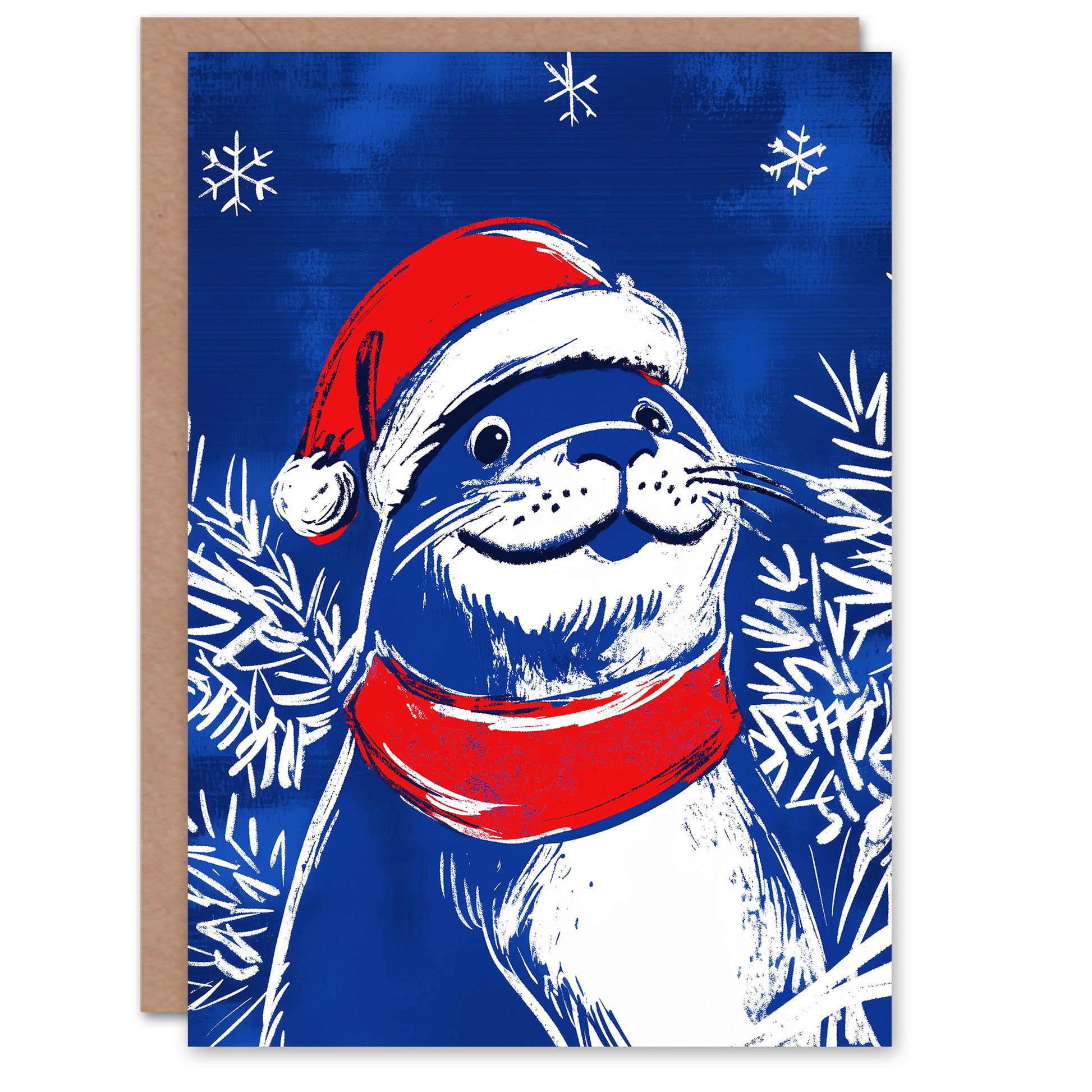 Cute Seal Santa Hat Scarf White Blue Fun Festive Christmas Card