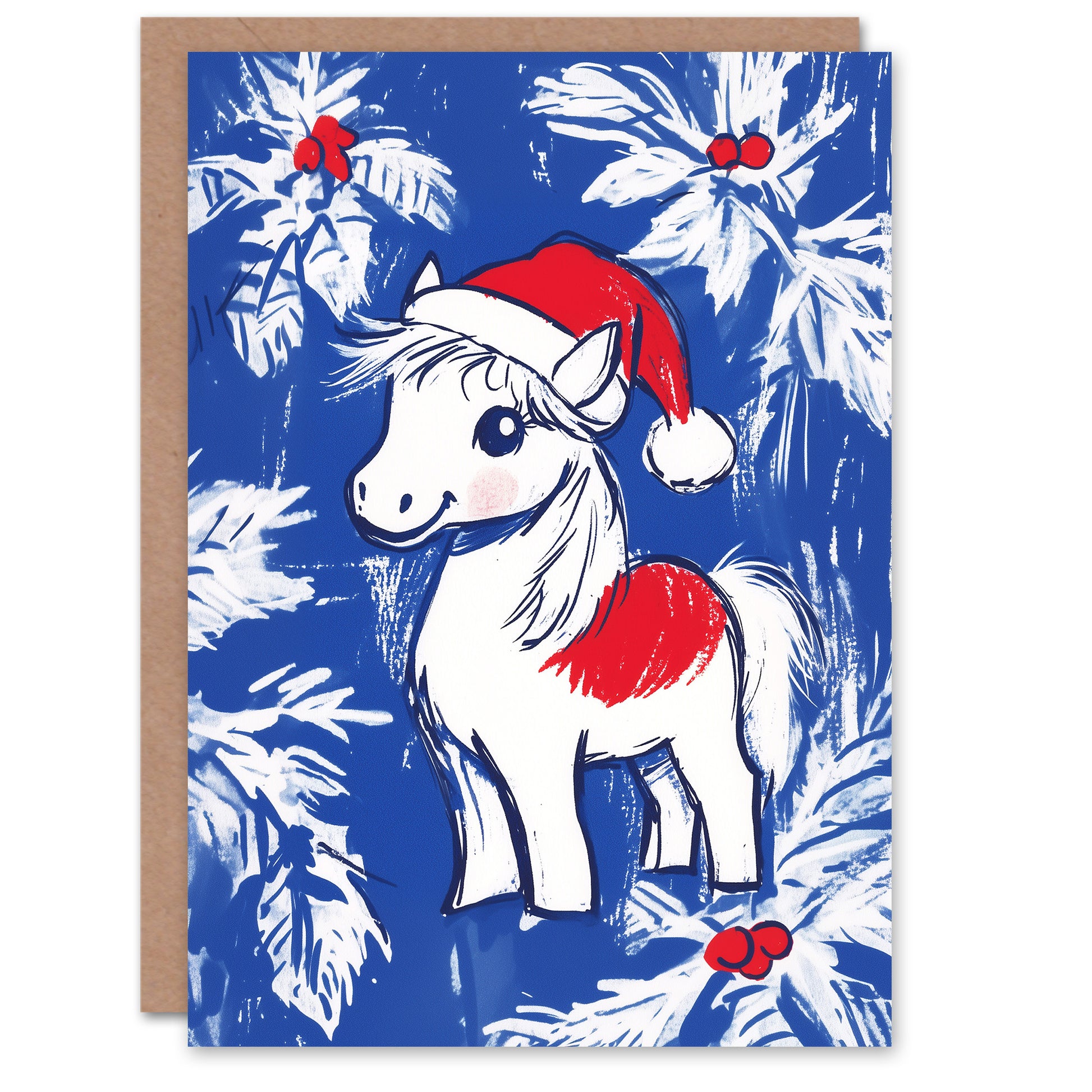 Cute Shetland Pony Santa Hat Holly Blue Fun Festive Christmas Card