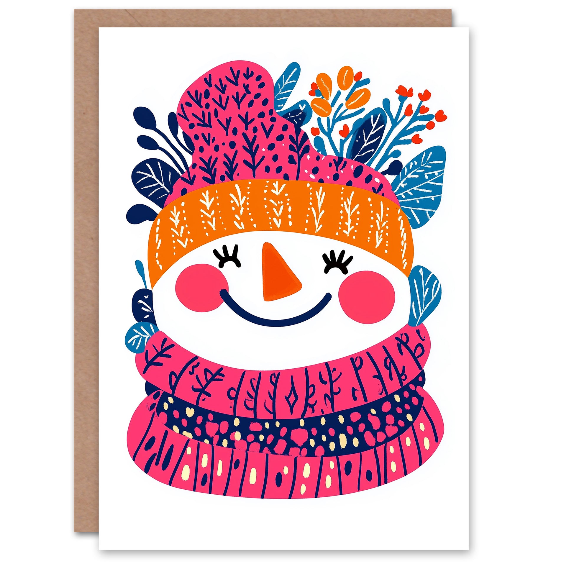 Cute Smiling Snowman Pink Orange Modern Folk Art Christmas Card