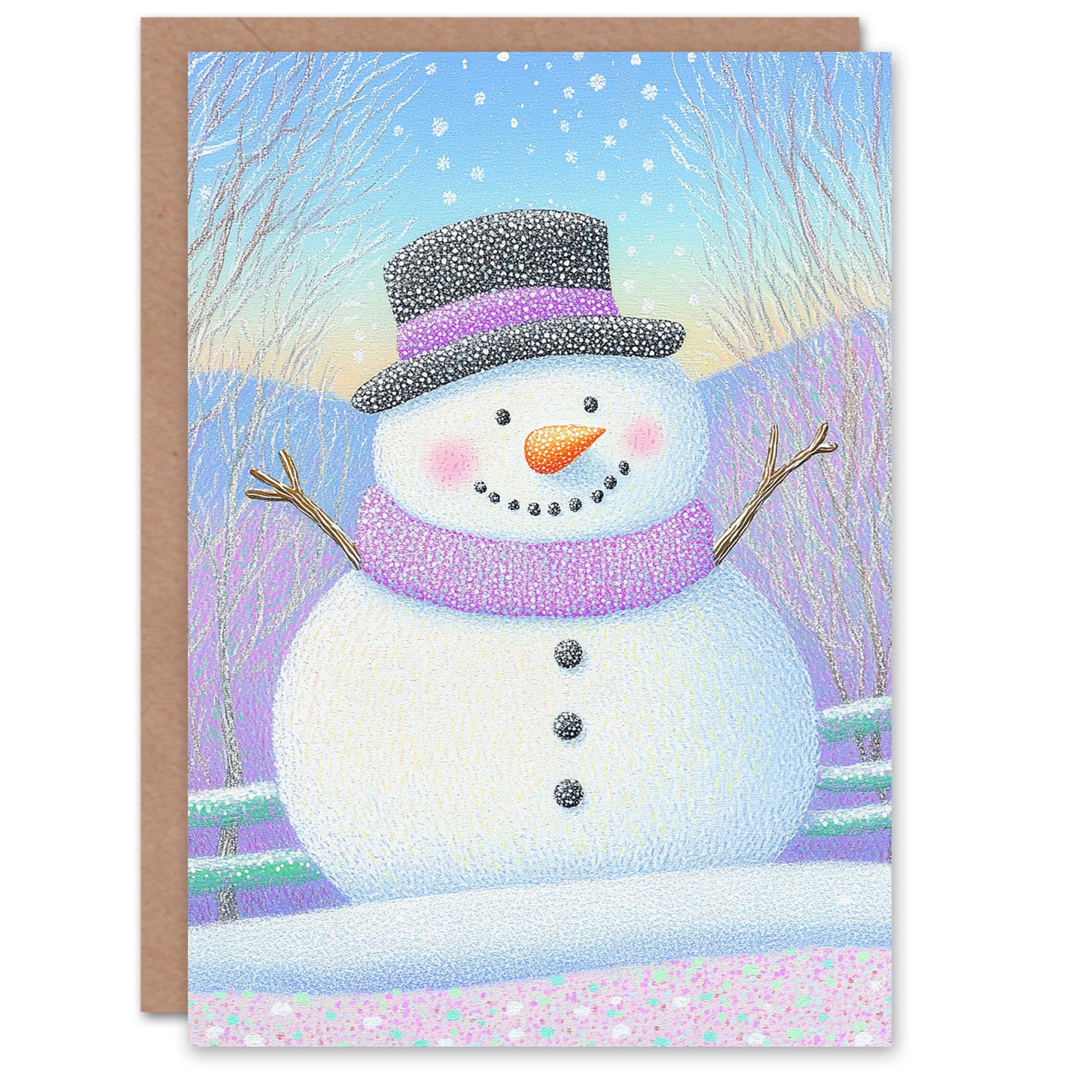 Cute Snowman Pastel Purple Winter Countryside Christmas Card