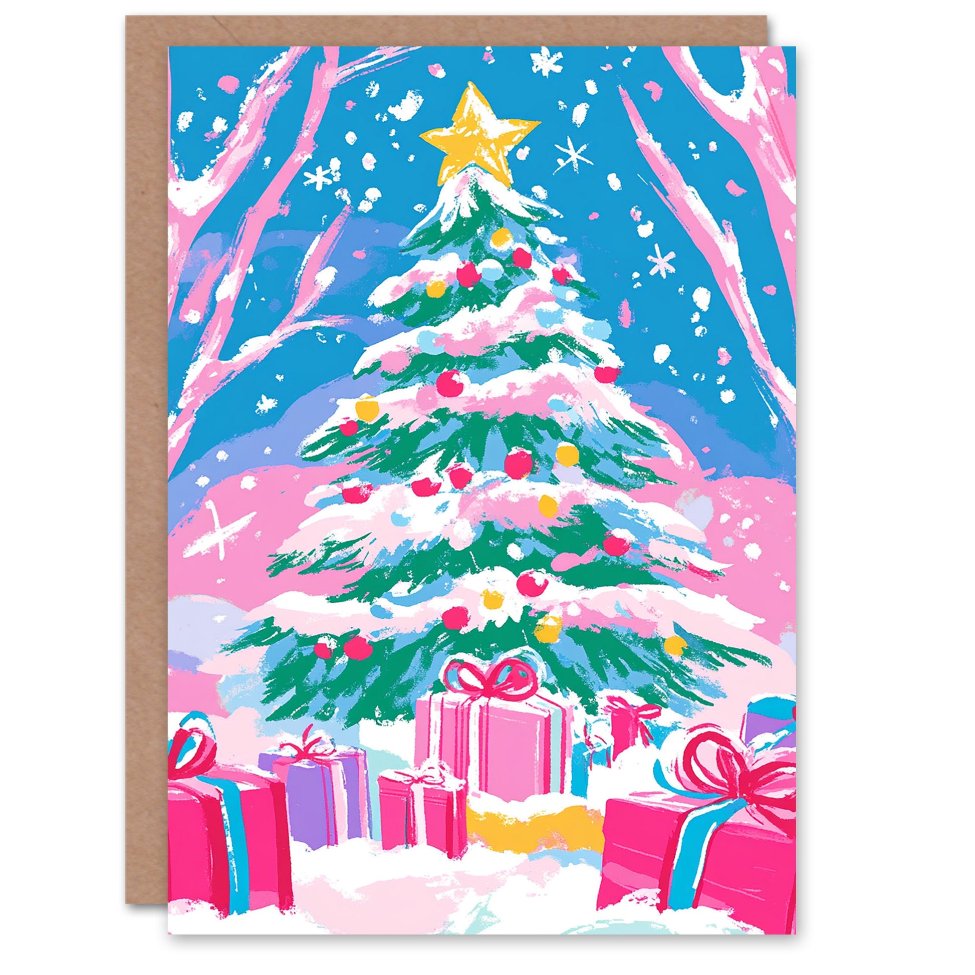 Decorated Tree Presents Pastel Pink Winter Forest Christmas Card