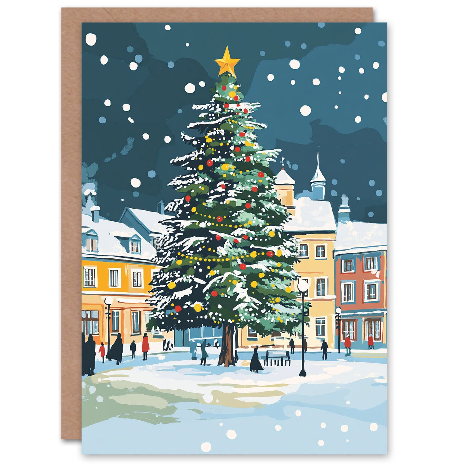 Decorated Tree Town Square Winter Snow Fun Festive Christmas Card