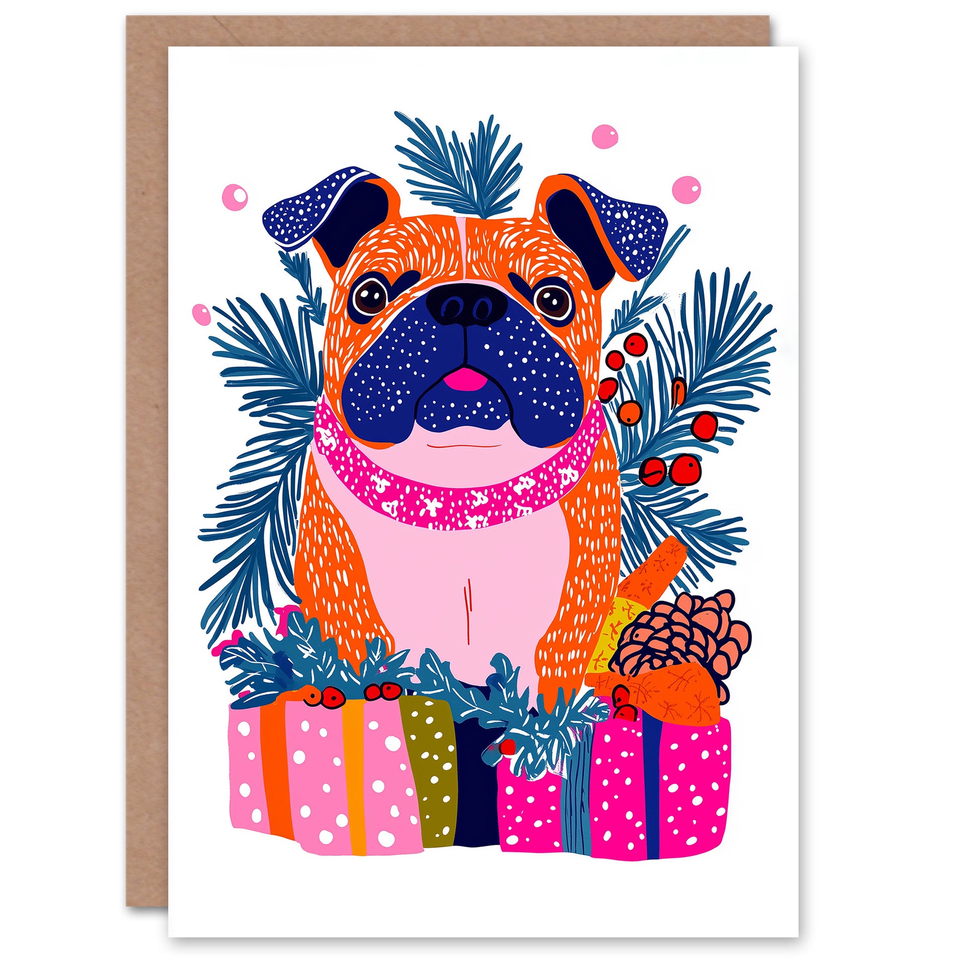 Dog Lover Cute Pug with Presents Vibrant Modern Festive Christmas Card