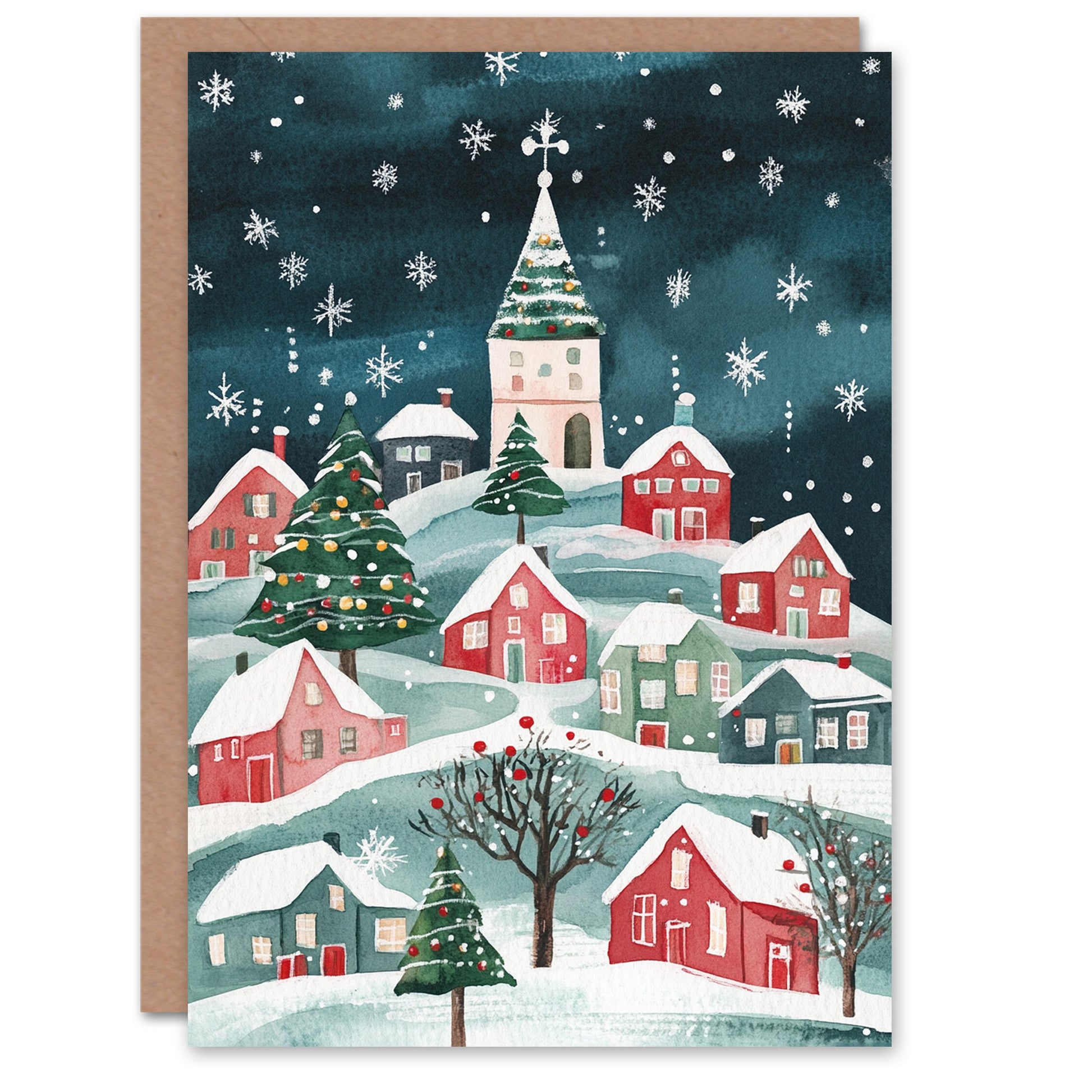 Festive Hill Town Winter Trees Festive Xmas Art Christmas Card