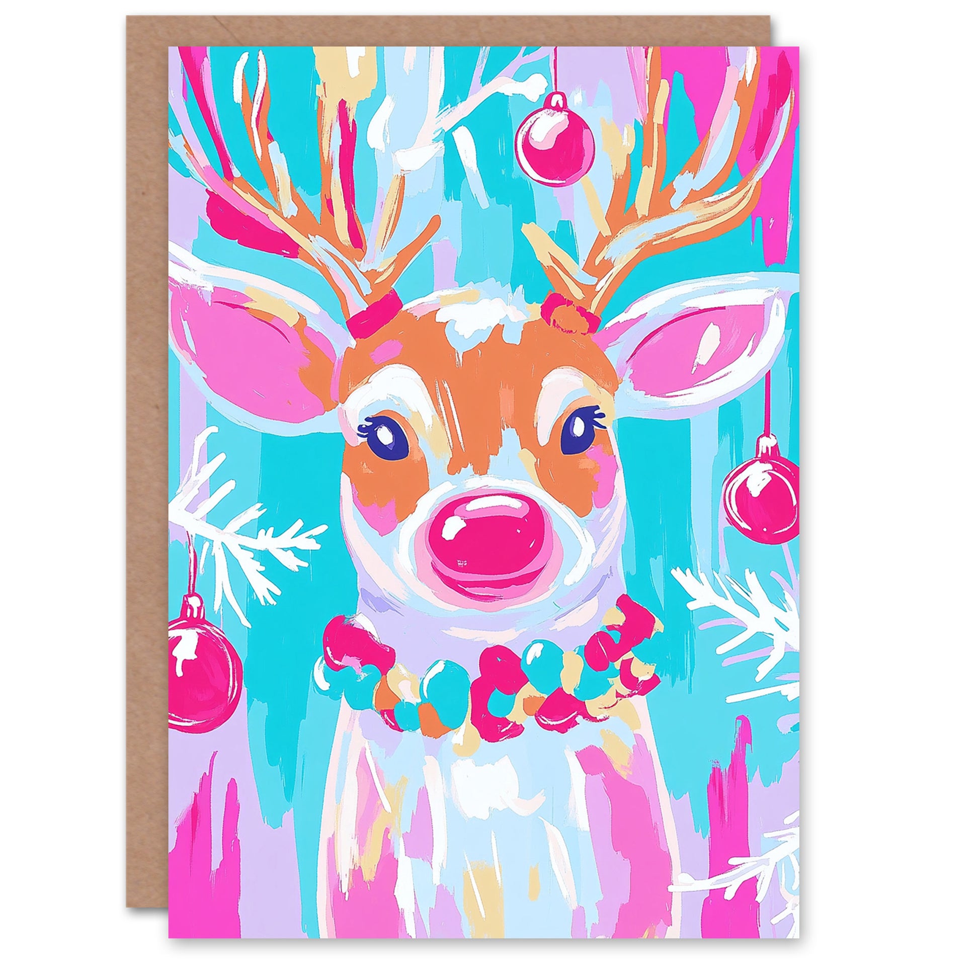 Festive Reindeer Vibrant Pink Blue Modern Festive Christmas Card