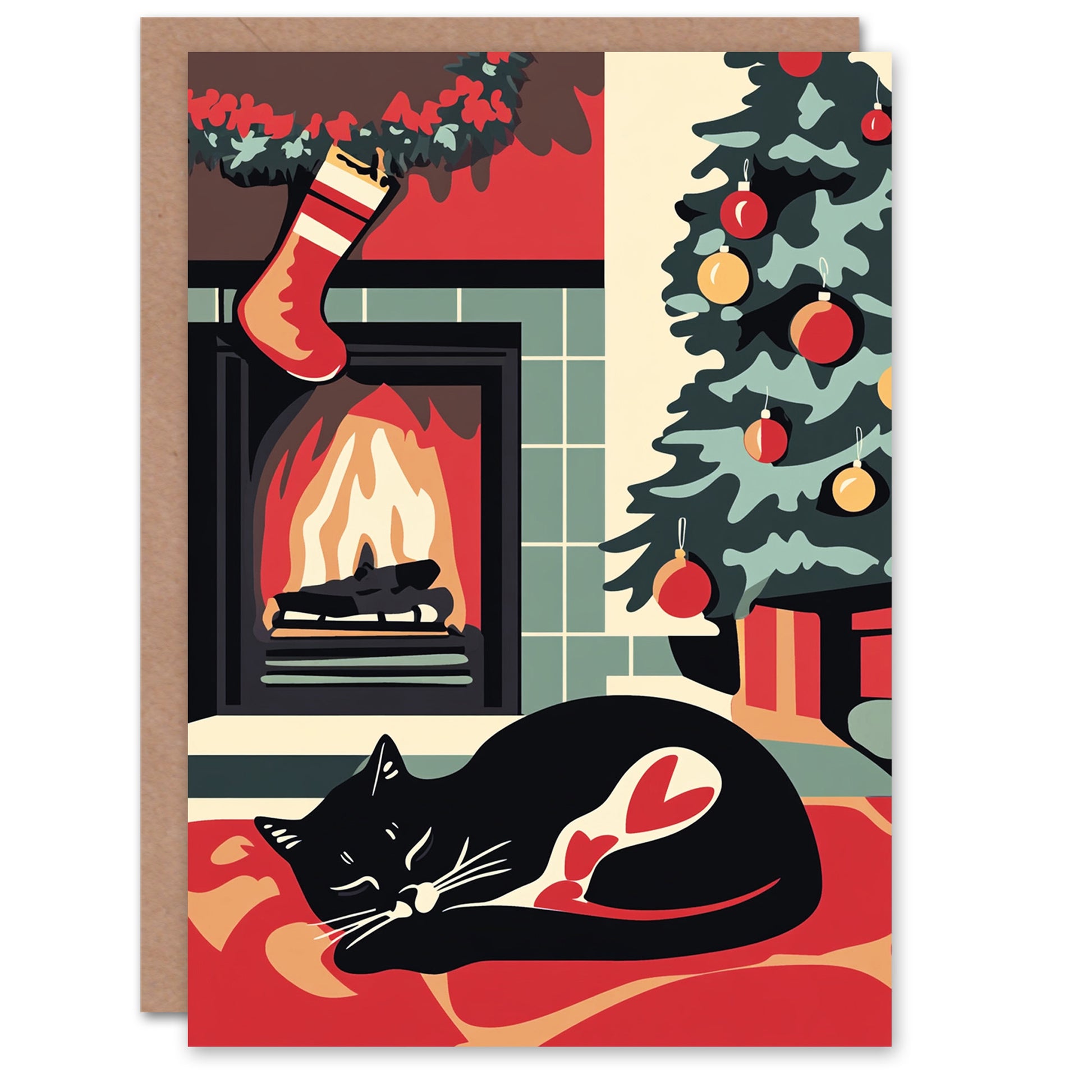 Fireplace Decorated Tree Cat Lover Christmas Card