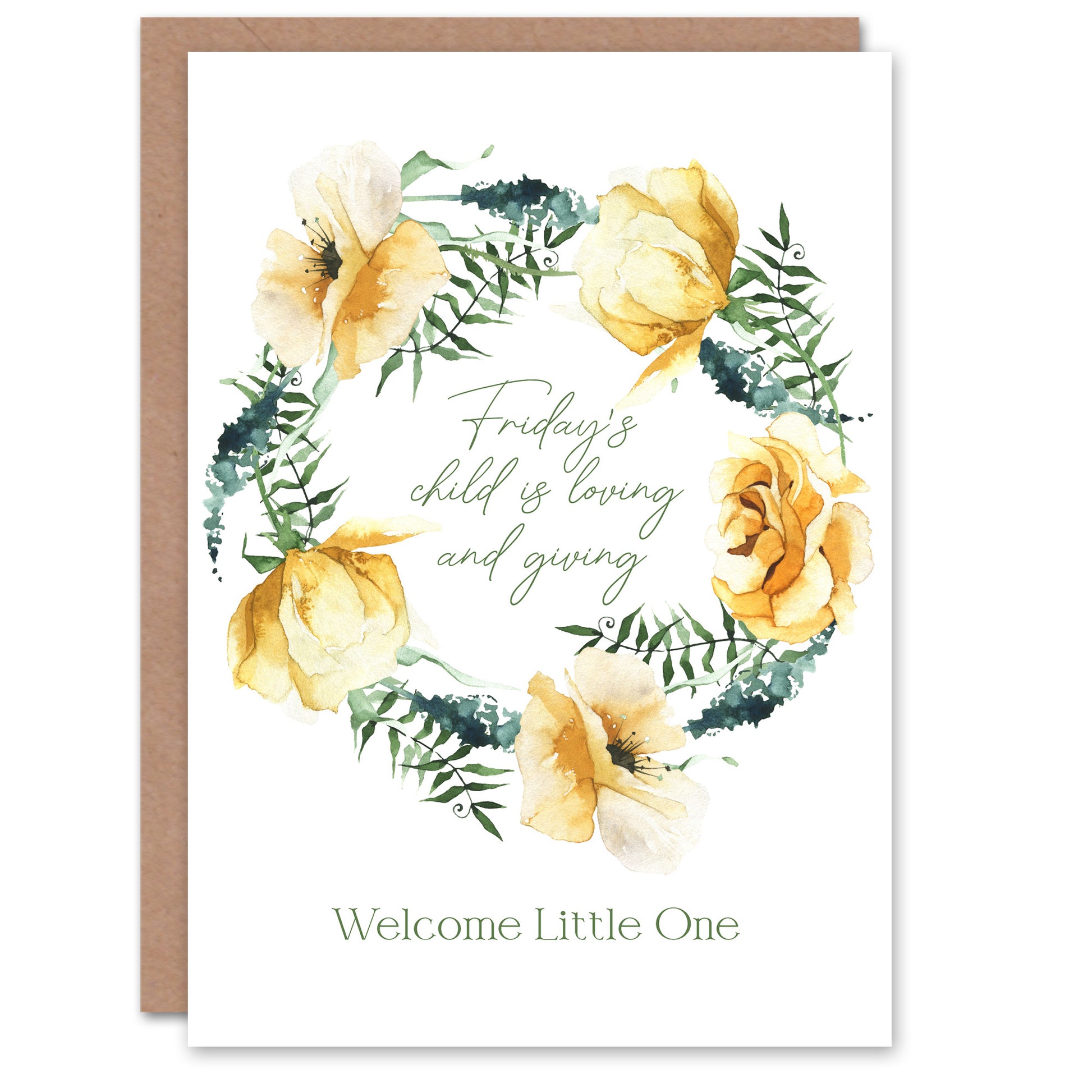 Friday's Child Loving and Giving Floral Wreath New Baby Card