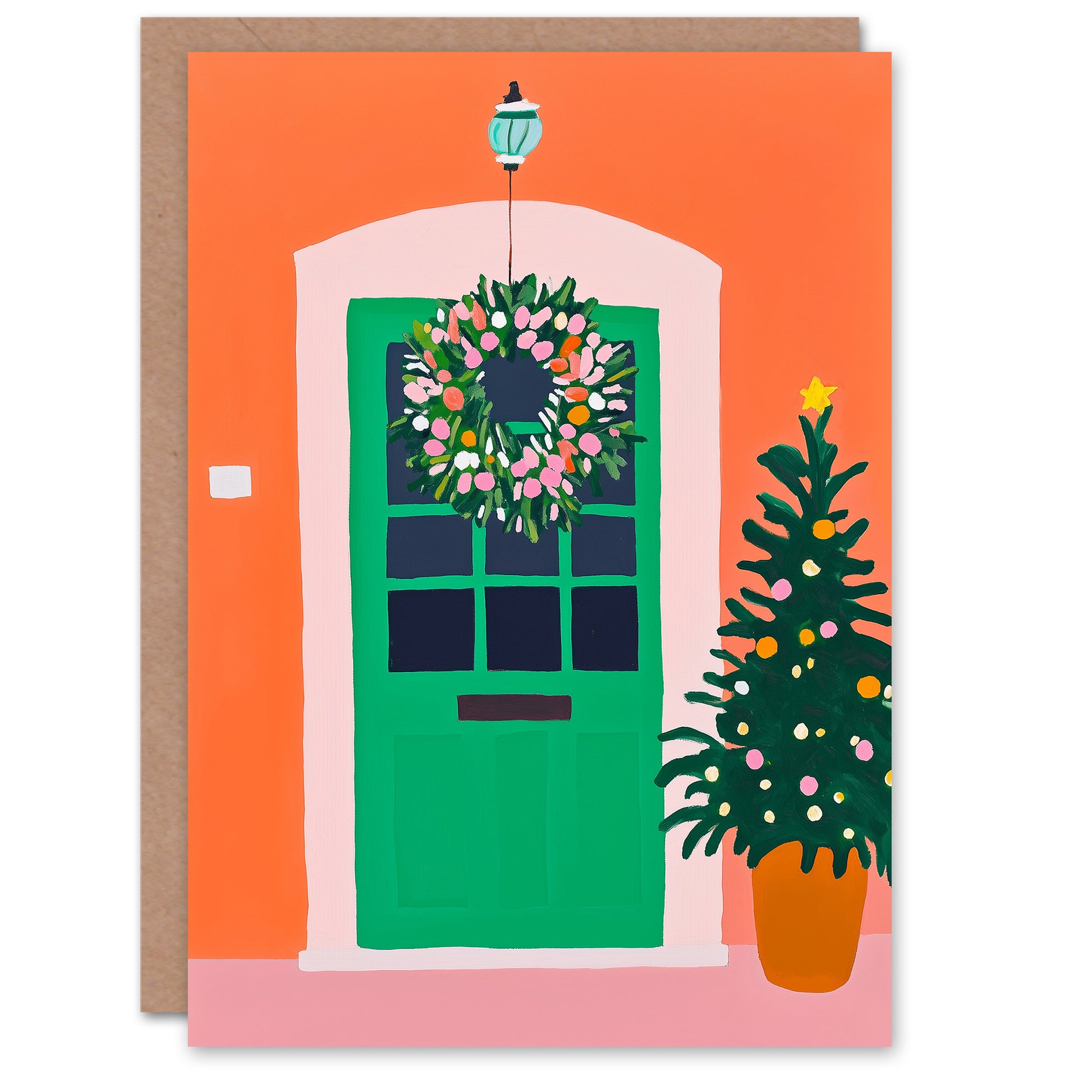 Front Door Wreath Decorated Potted Tree Christmas Card