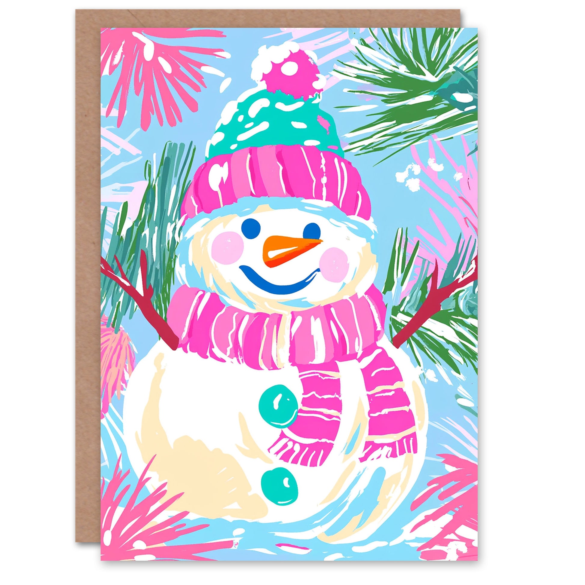 Happy Snowman Bright Pink Green Blue Modern Christmas Card