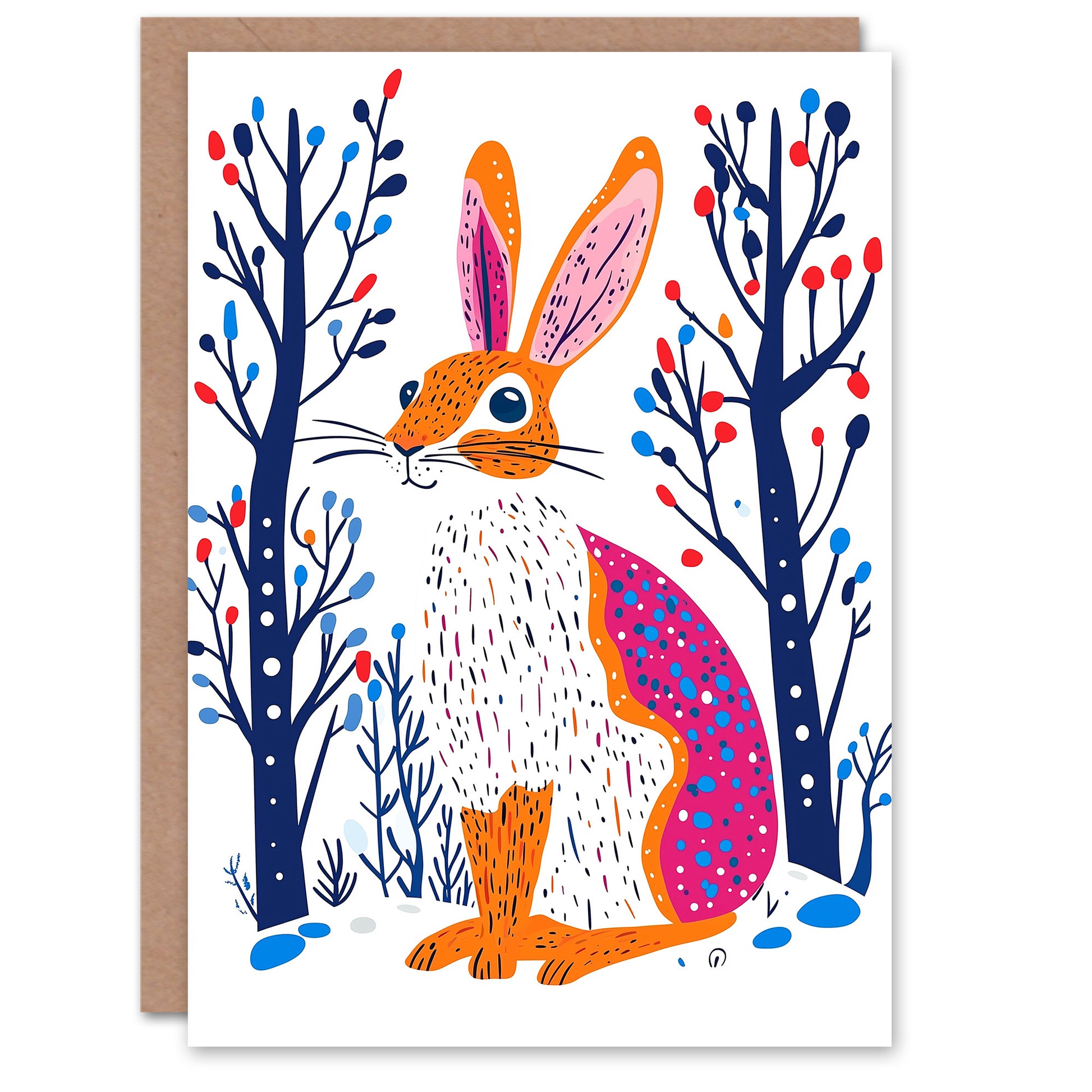 Hare Rabbit in Winter Landscape Modern Folk Art Christmas Card