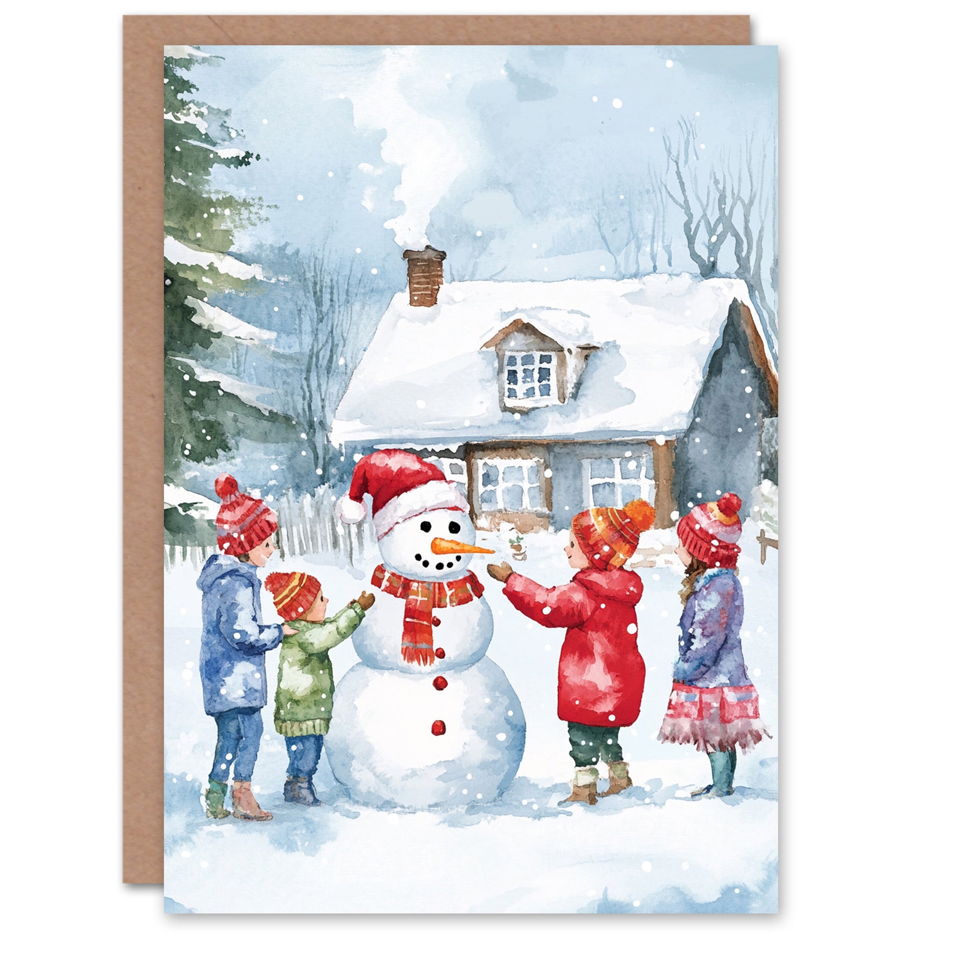Kids Build Snowman Cottage Garden Fun Christmas Card