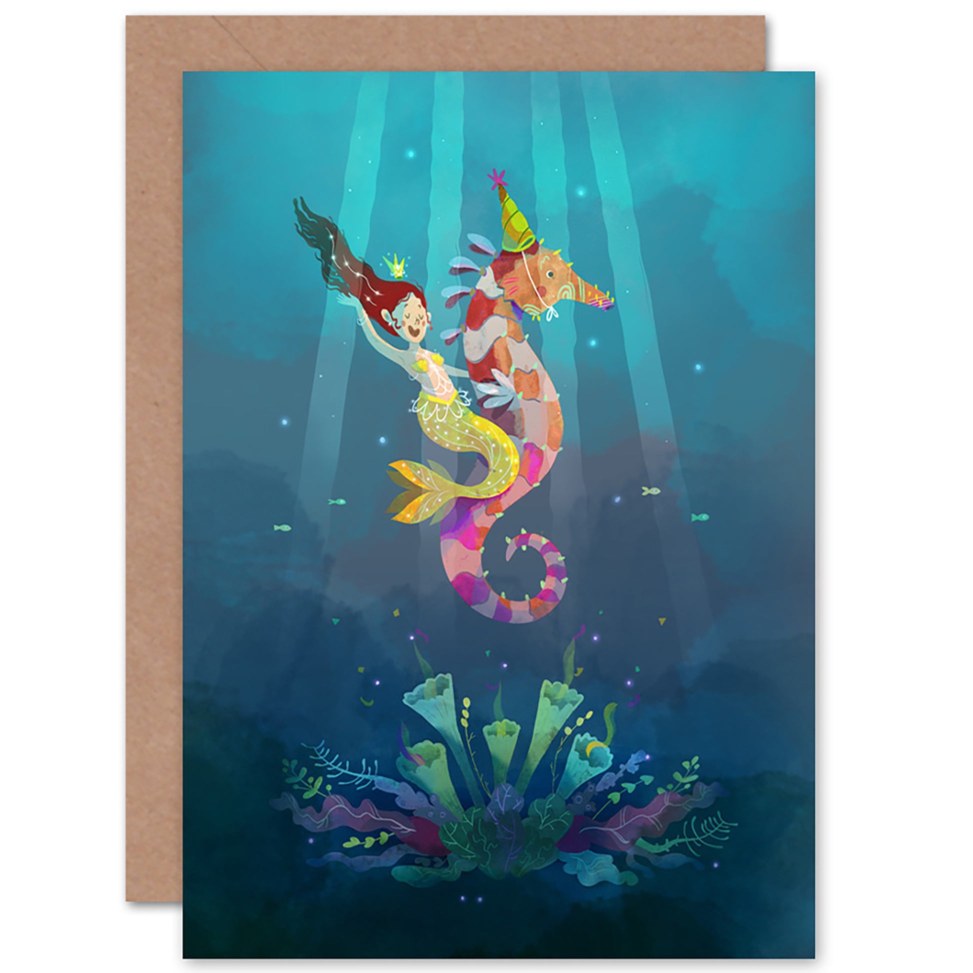 Mermaid Yellow Seahorse Kids Birthday Birthday Card