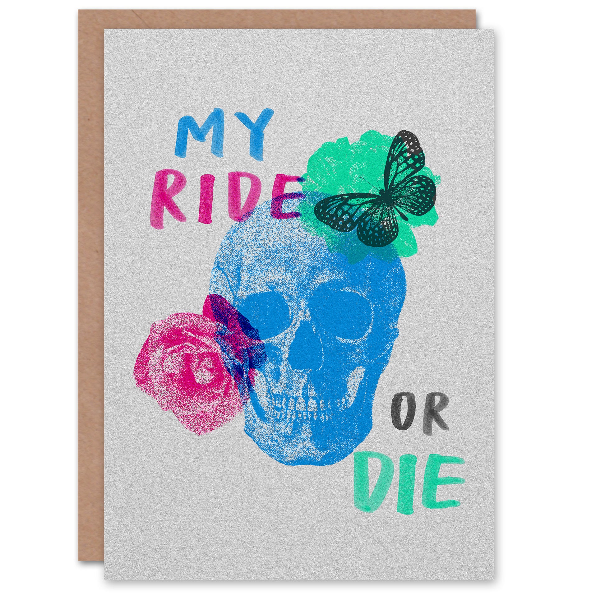My Ride Or Die Skull With Roses and Butterfly Art Card