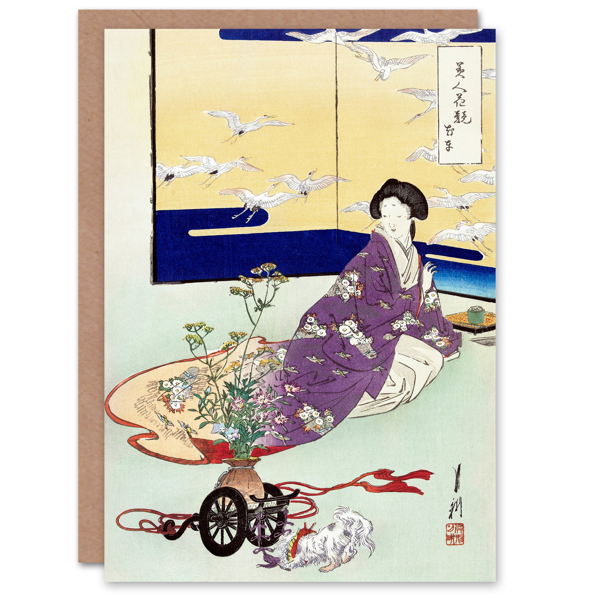 Ogata Gekko Japanese Pet Dog Playing With Flower Cart Greetings Card