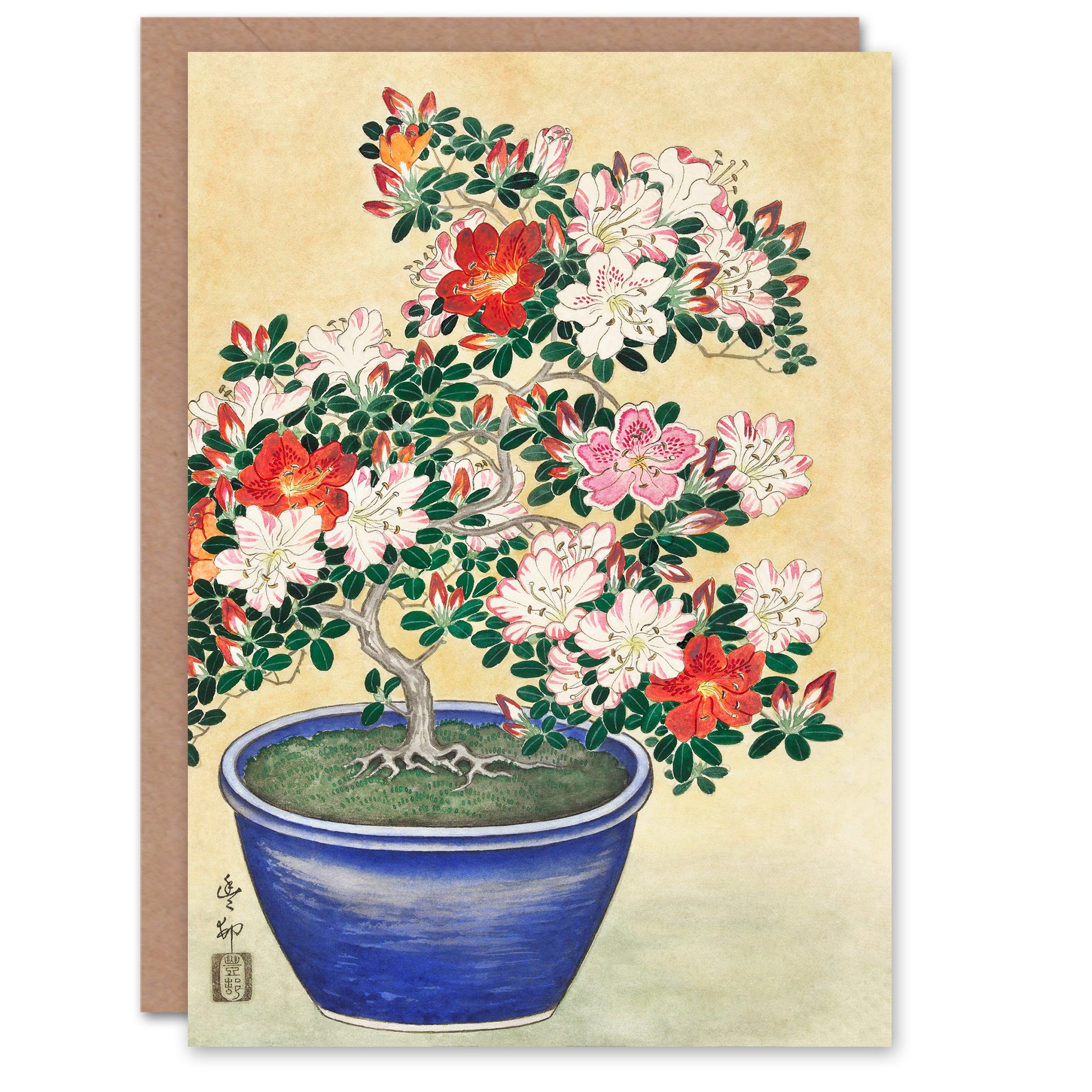 Ohara Koson Japanese Blooming Azalea In Blue Pot Greetings Card