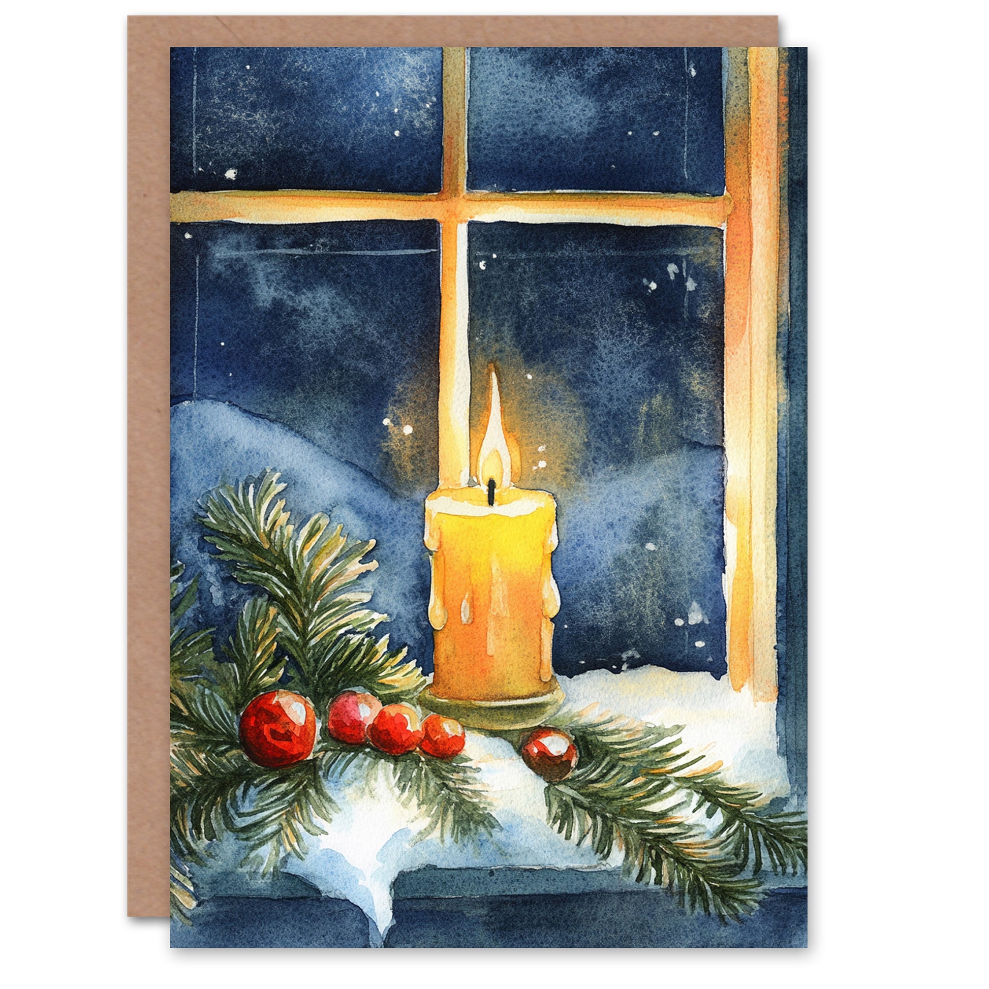 Pillar Candle Holly Pine Window Snow Christmas Card