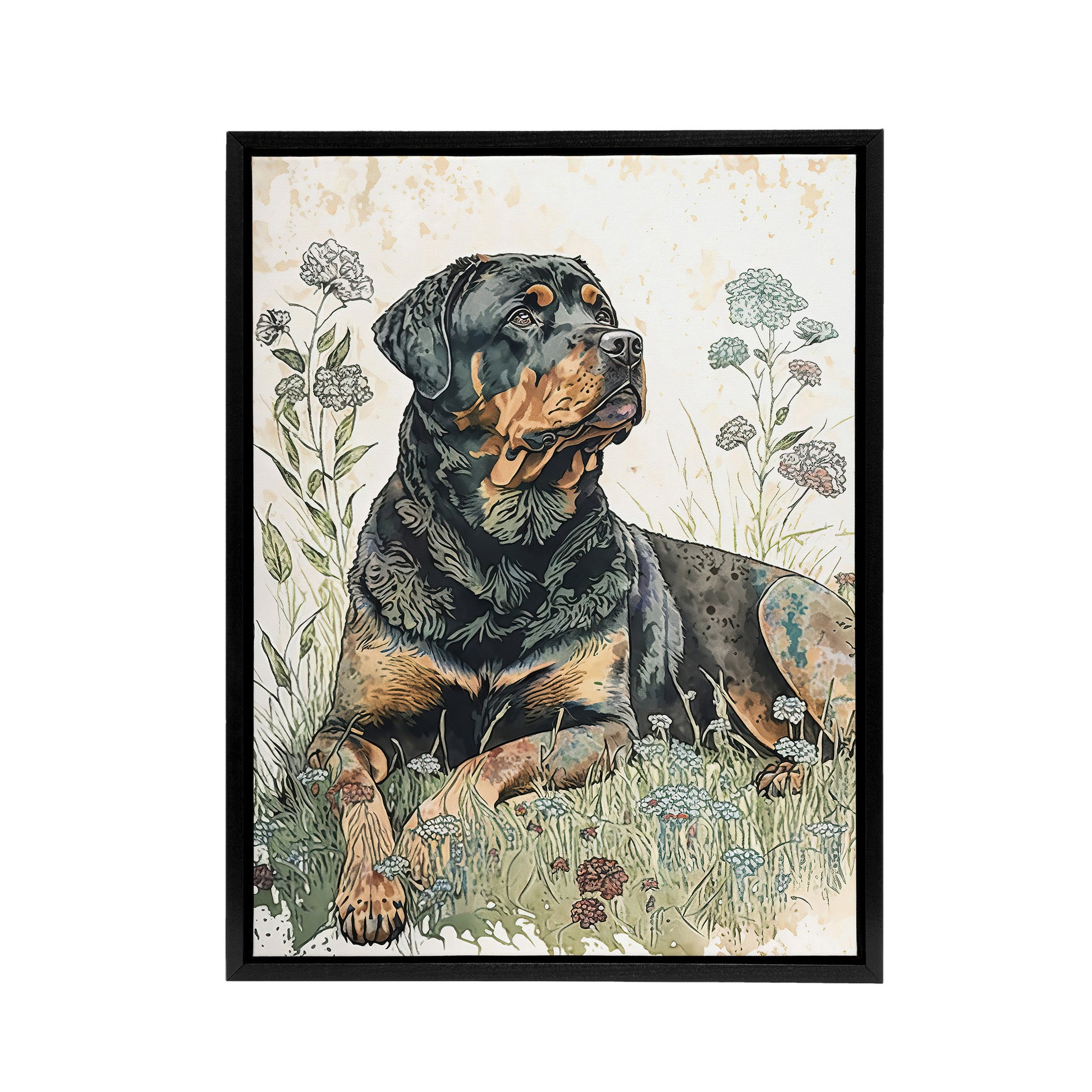 Rottweiler Dog Laying In Wildflowers Black Framed Canvas Wall Art Print