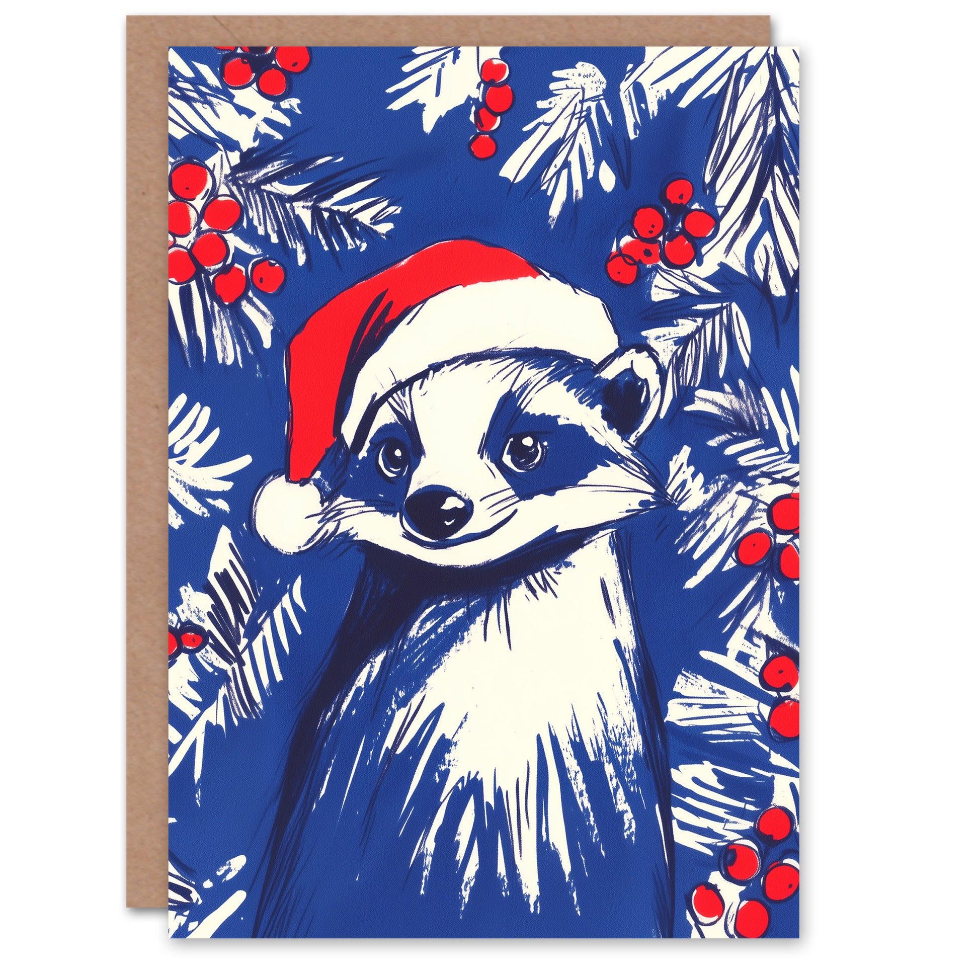 Santa Hat Badger Holly Plant Berry Fun Festive Xmas Christmas Card