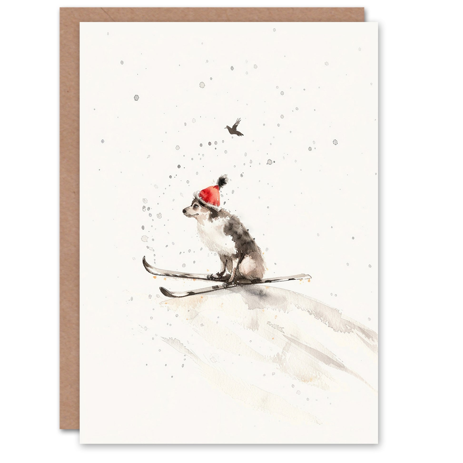 Santa Hat Collie Skiing Festive Dog Lover Xmas Christmas Card