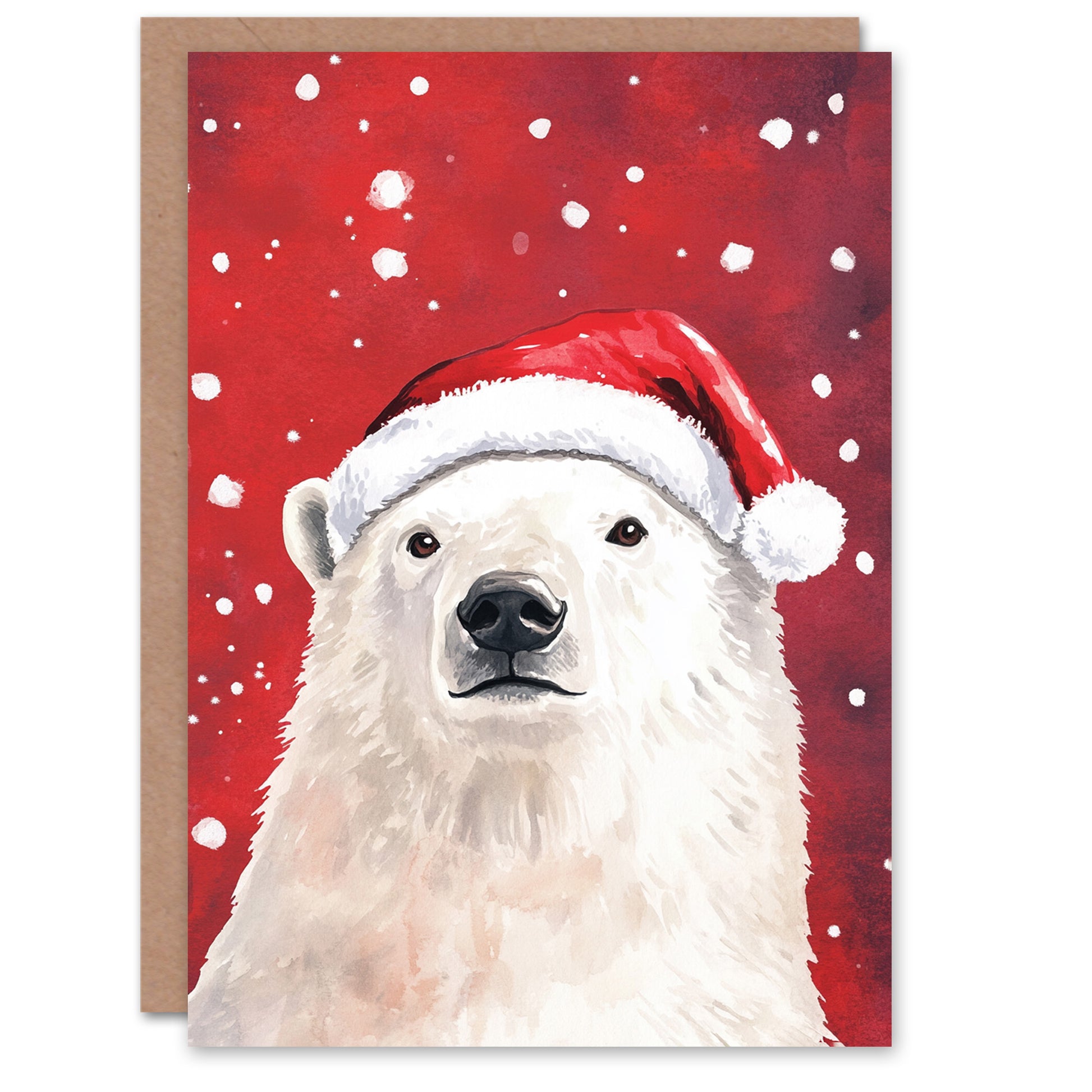 Santa Hat Polar Bear in Snow Festive Xmas Christmas Card