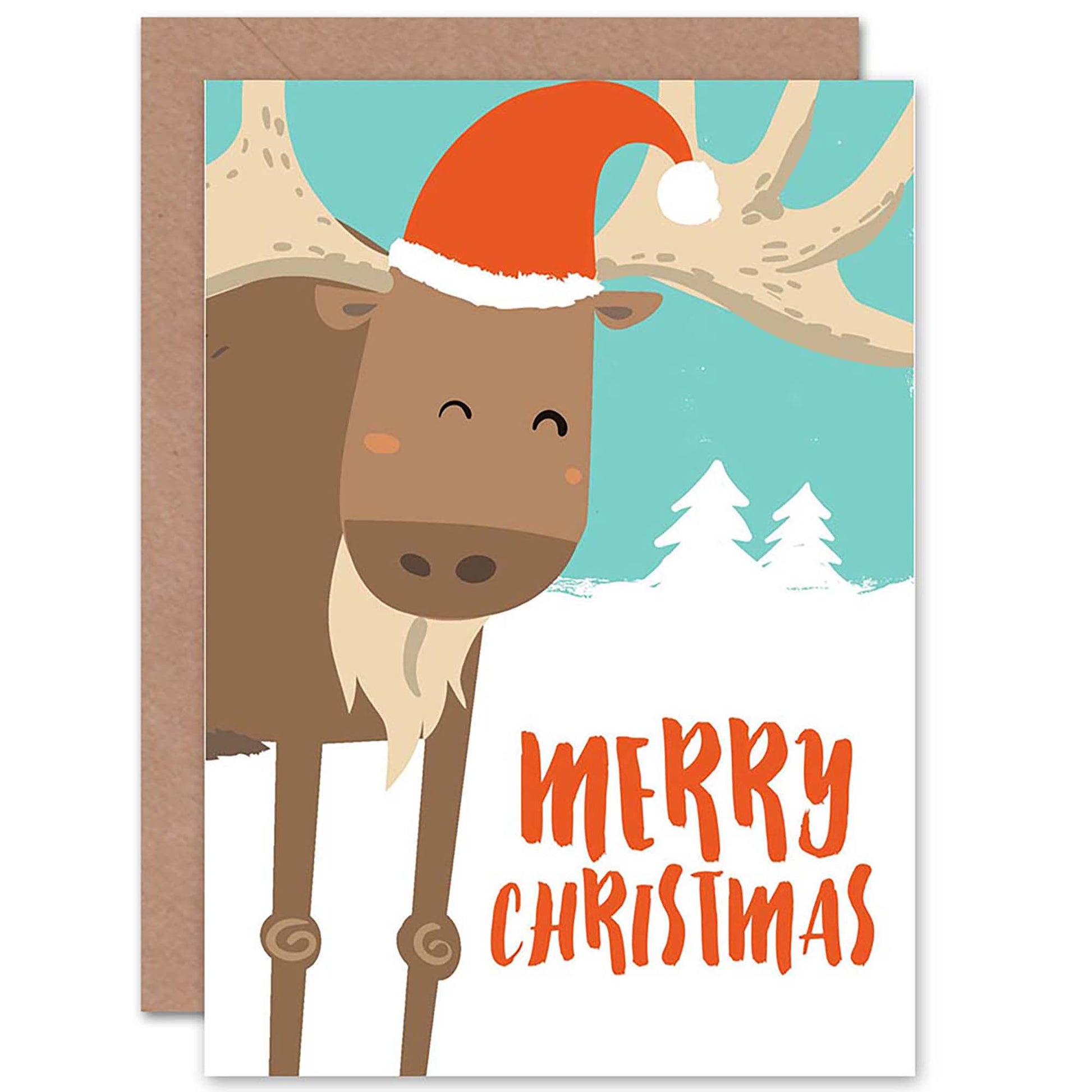 Santa Hat Reindeer Snowy Forest Cute Cartoon Christmas Card