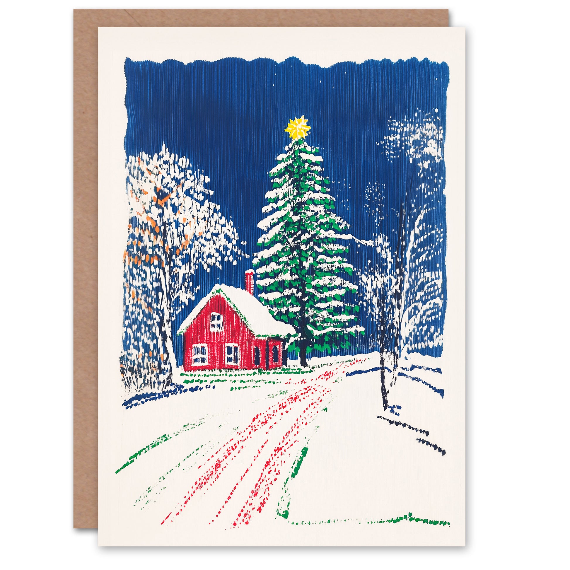 Scandinavia Red Cottage Tree Winter Festive Xmas Christmas Card