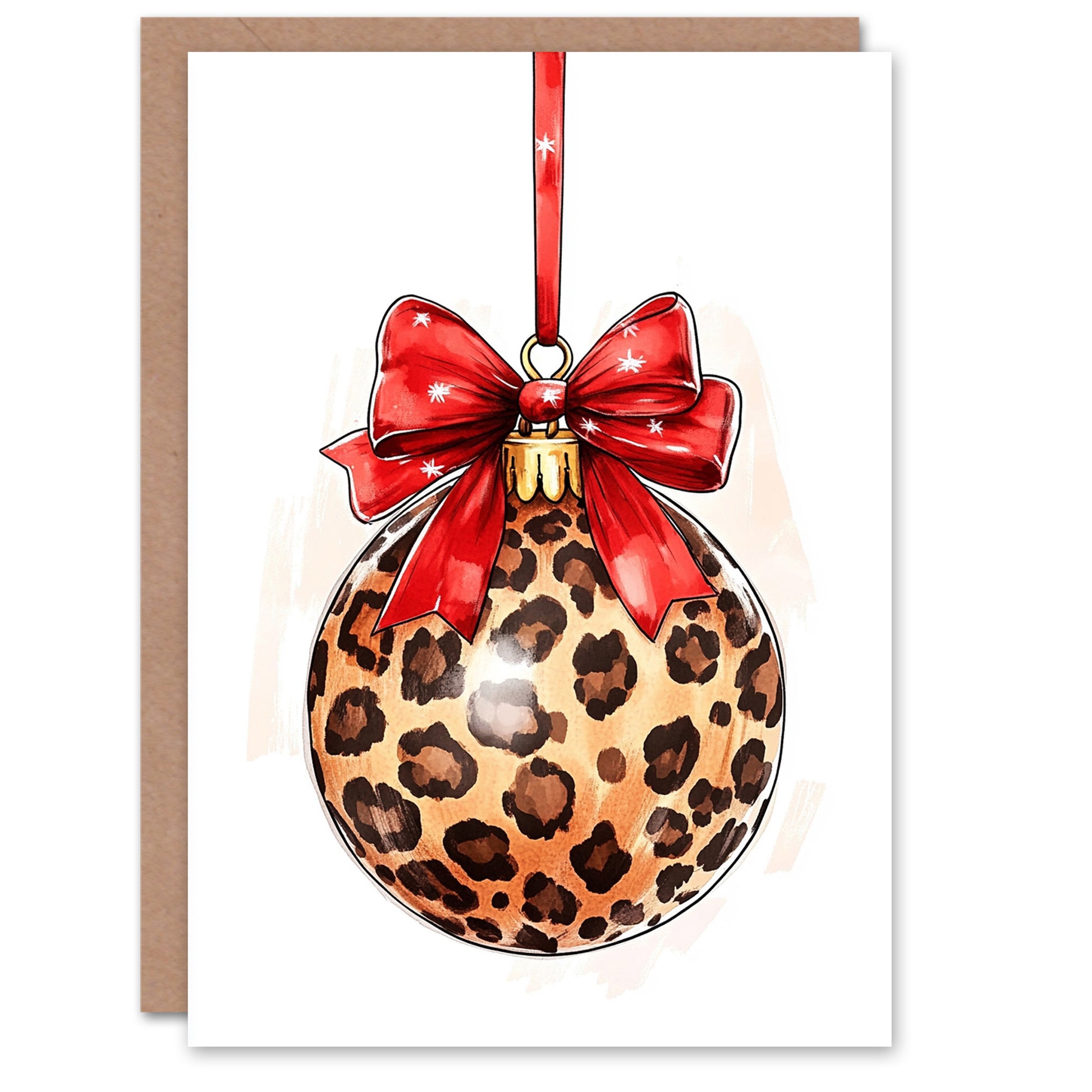 Single Leopard Print Bauble Bow Watercolour Christmas Card