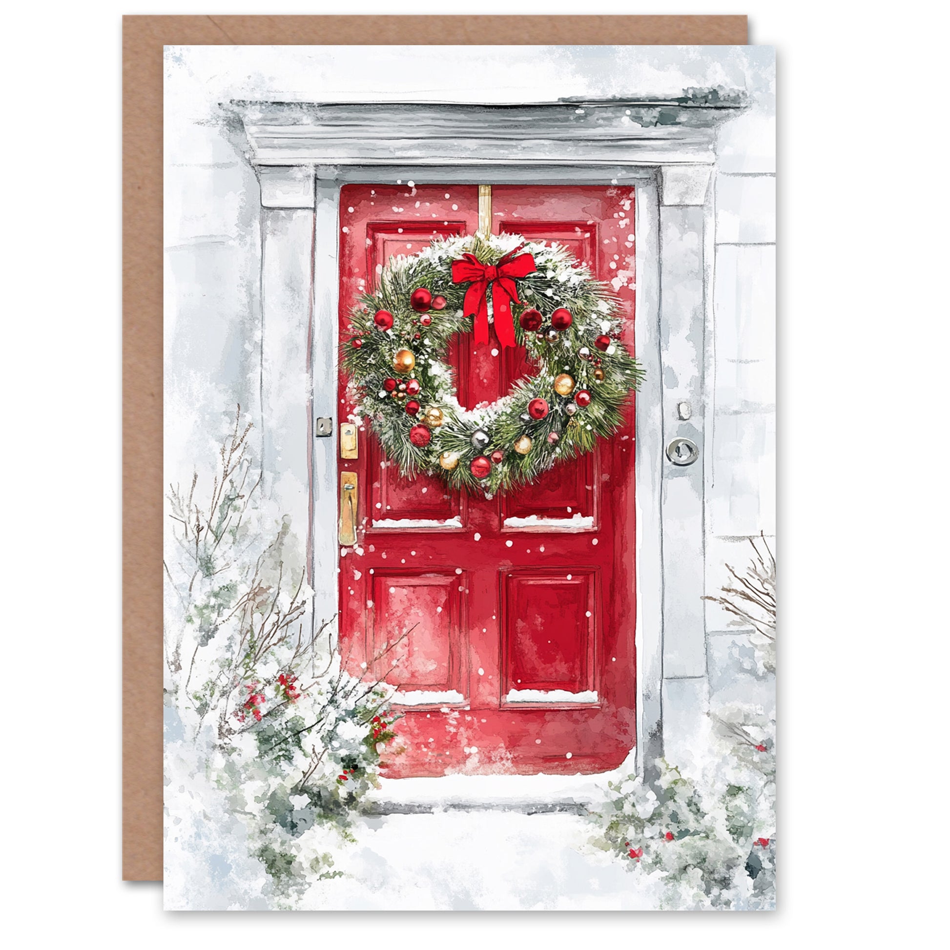 Snow Covered Bauble Wreath Red Door Festive Christmas Card