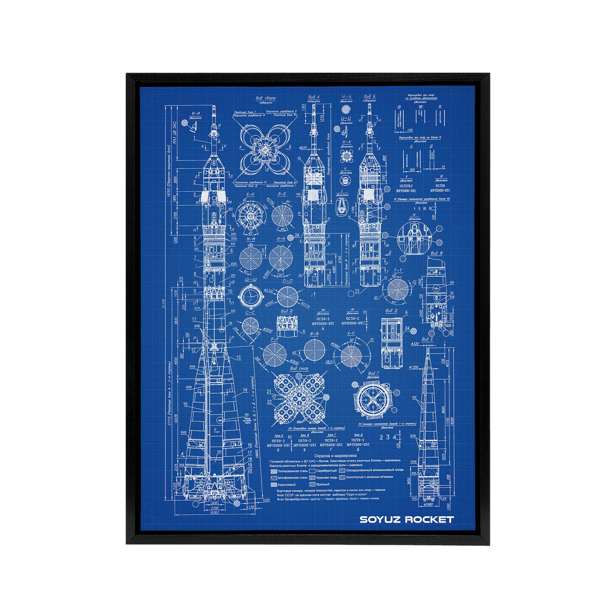 Soyuz Rocket USSR Soviet Space Blueprint Black Framed Canvas Art Print
