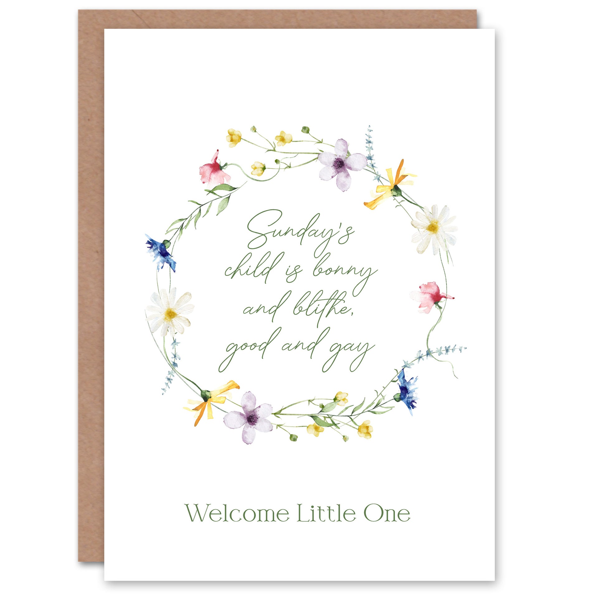 Sunday's Child is Bonnie and Blithe Floral Wreath New Baby Card