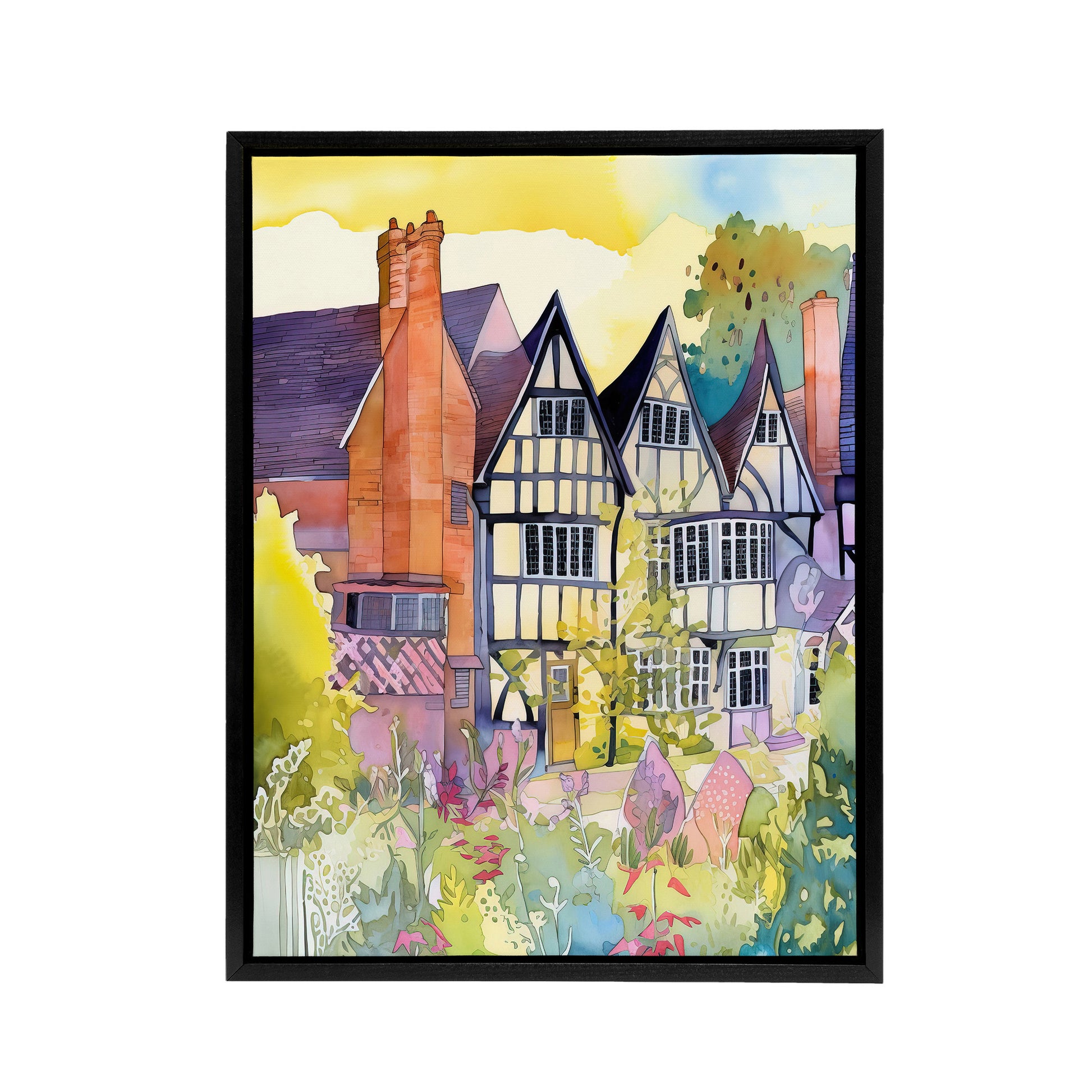 Sunrise Over Tudor Houses Floral Black Framed Canvas Wall Art Print