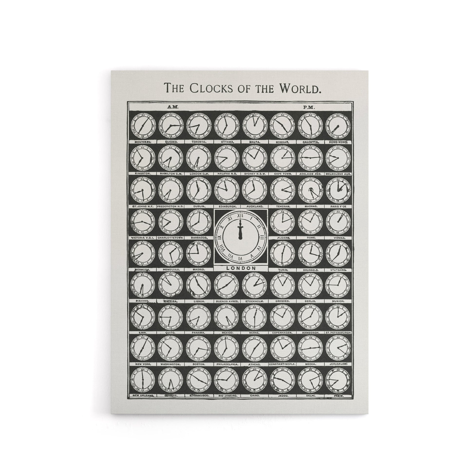 The Clocks of the World from Medicology – A fascinating 1910 vintage wall art print displaying the world’s clocks and time zones. This antique chart highlights global geography and design precision, perfect for studies or offices. It adds intellect, order, and timeless curiosity to your wall decor with historic monochrome appeal and intricate detail.