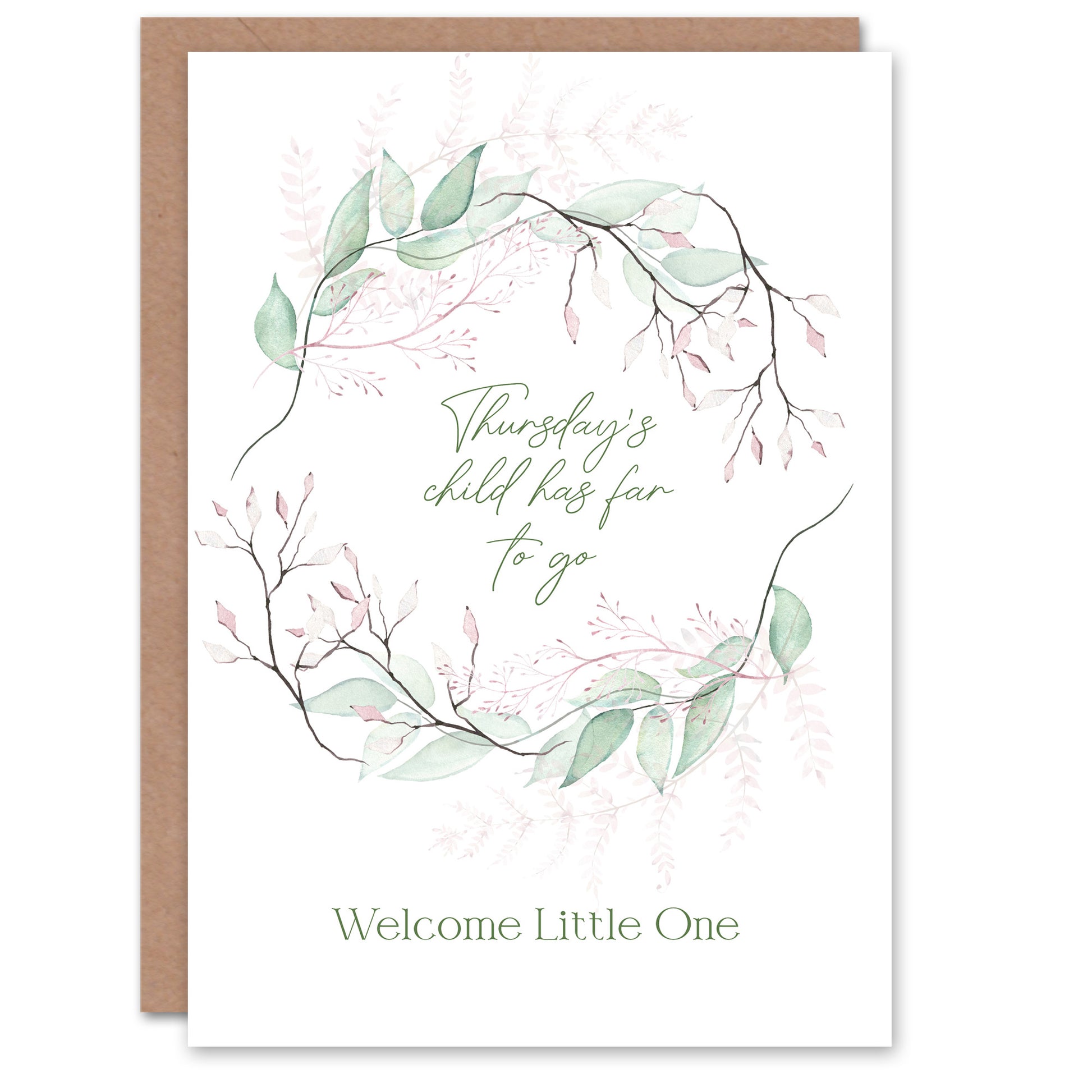 Thursday's Child Has Far To Go Floral Wreath New Baby Card