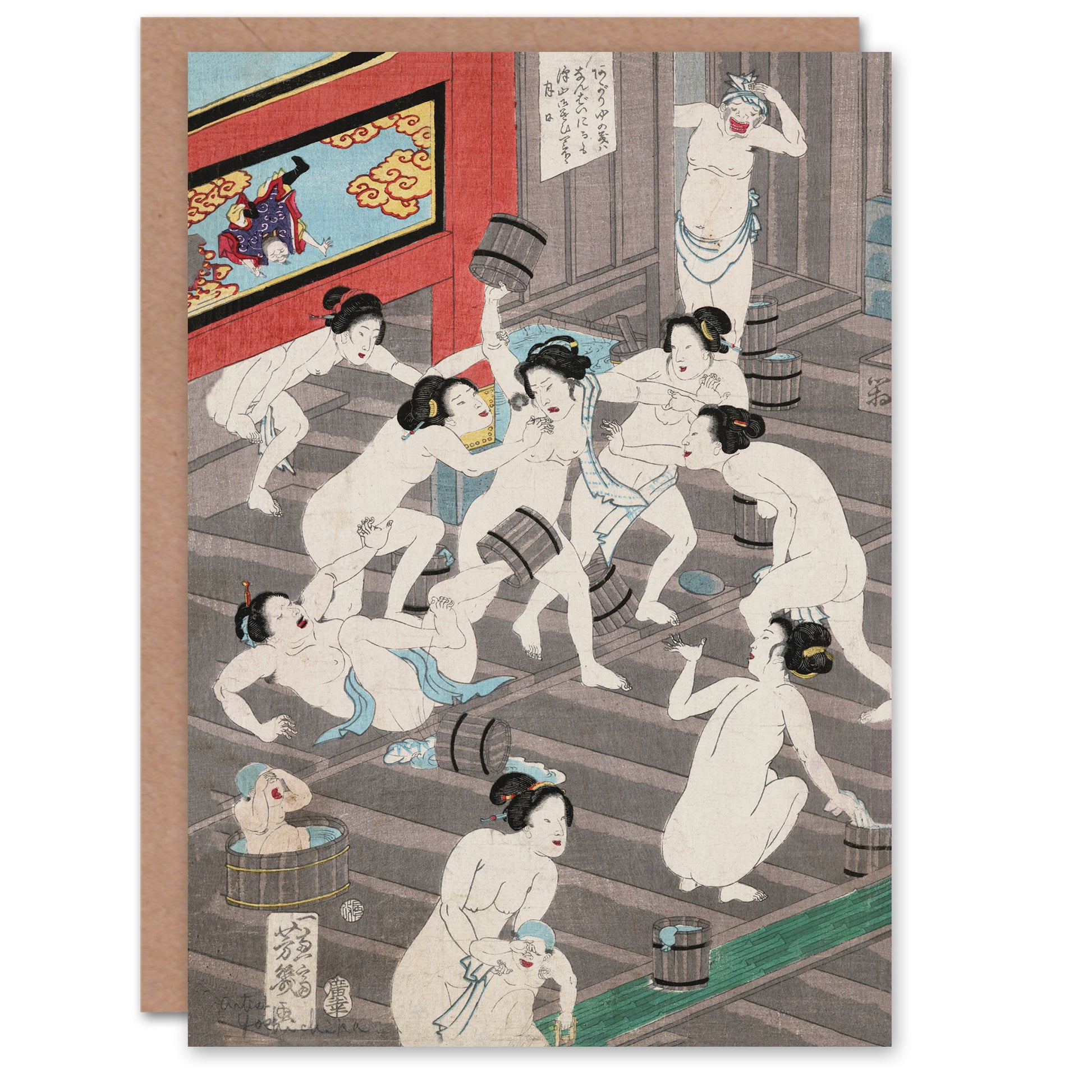 Toyohara Kunichika Japanese Fight In Women's Public Bath Greetings Card