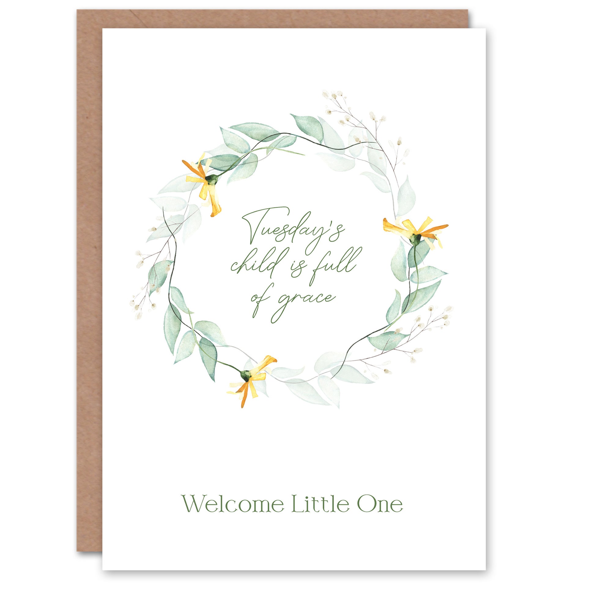 Tuesday's Child is Full of Grace Floral Wreath New Baby Card