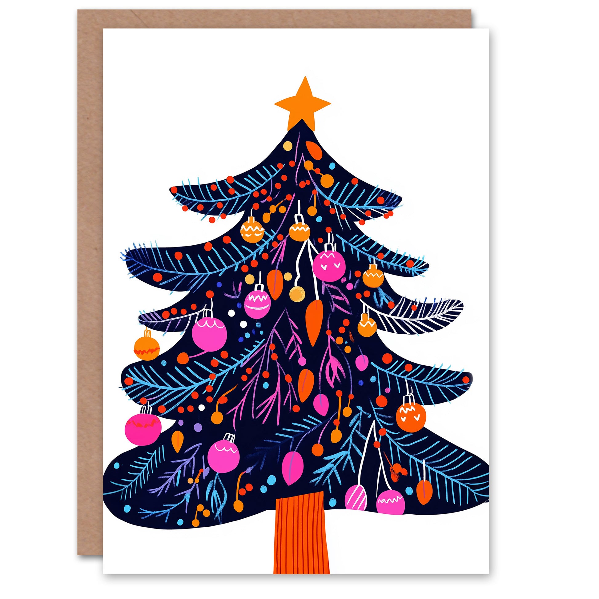 Vibrant Folk Art Orange Pink Blue Decorated Tree Christmas Card