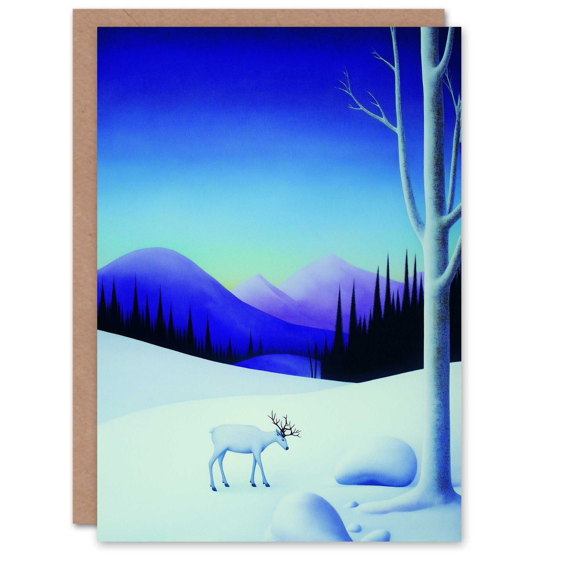White Reindeer in Snow Winter Mountain Landscape Christmas Card
