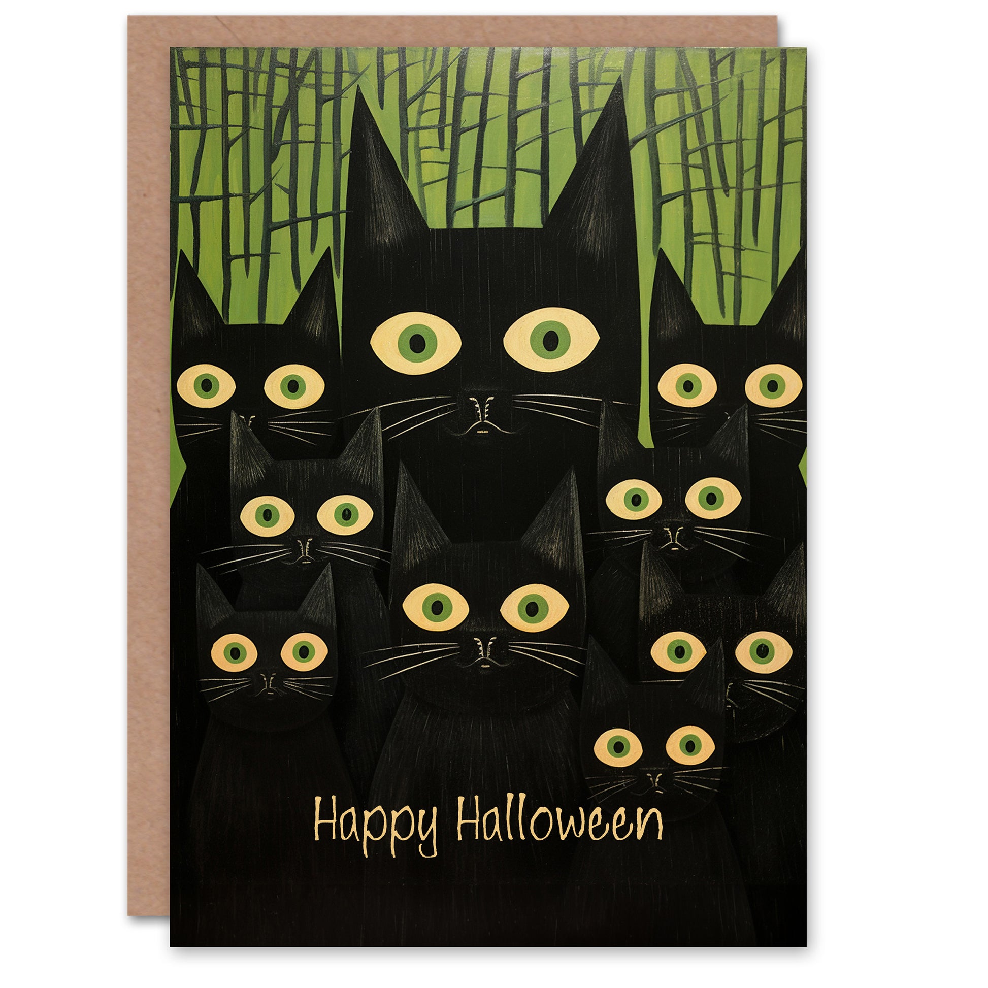 Witch Feline Pack Spooky Green Eye Clowder Halloween Card