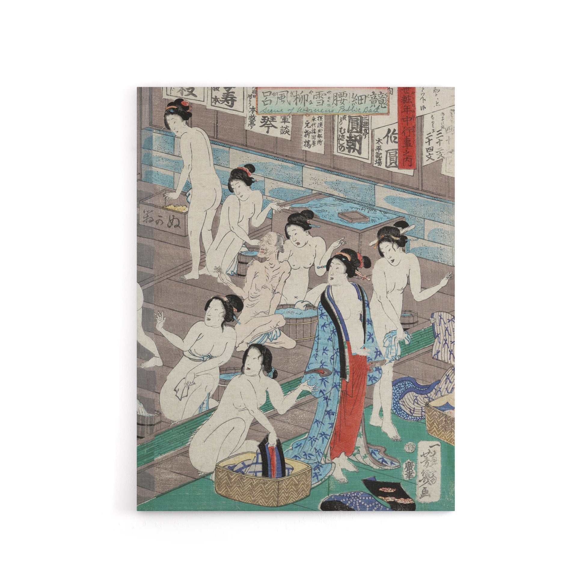 Women In Public Bath Canvas Wall Art Print Toyohara Kunichika – A detailed and expressive Edo-period print by Toyohara Kunichika illustrating daily life within a public bathhouse. The composition blends movement, humour, and tradition. Perfect as artwork, home decor, or picture print, it enriches your wall with vintage character and storytelling. Printed on premium-quality materials for lasting tone and texture, it brings warmth and authenticity.